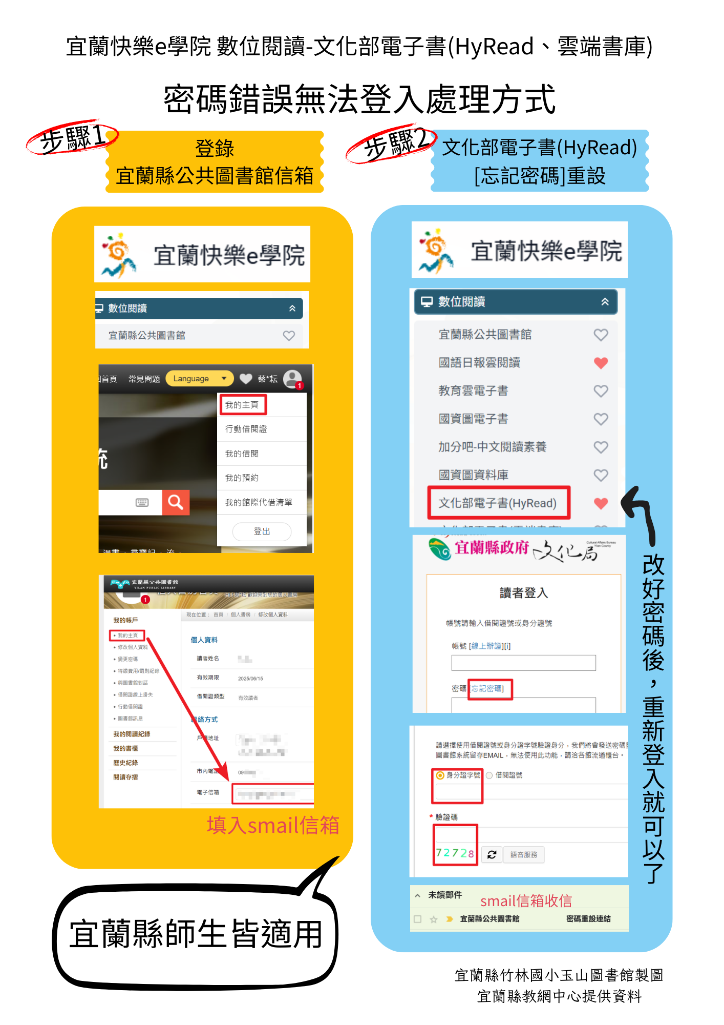 【宜蘭縣文化局HyRead電子書】密碼錯誤解決方法14 月 2025新的年度開始,有許多學生告訴孟耘老師文化局HyRead電子書無法登入,我詢問文化局、教網中心也提供解決方法。我將製成步驟流程圖,按照步驟操作快速搞定!宜蘭縣師生皆適用,歡迎分享留言區有部落格文章,內有PDF檔可以下載,印出來讓學生邊看邊操作!宜蘭縣文化局HyRead密碼錯誤解決流程