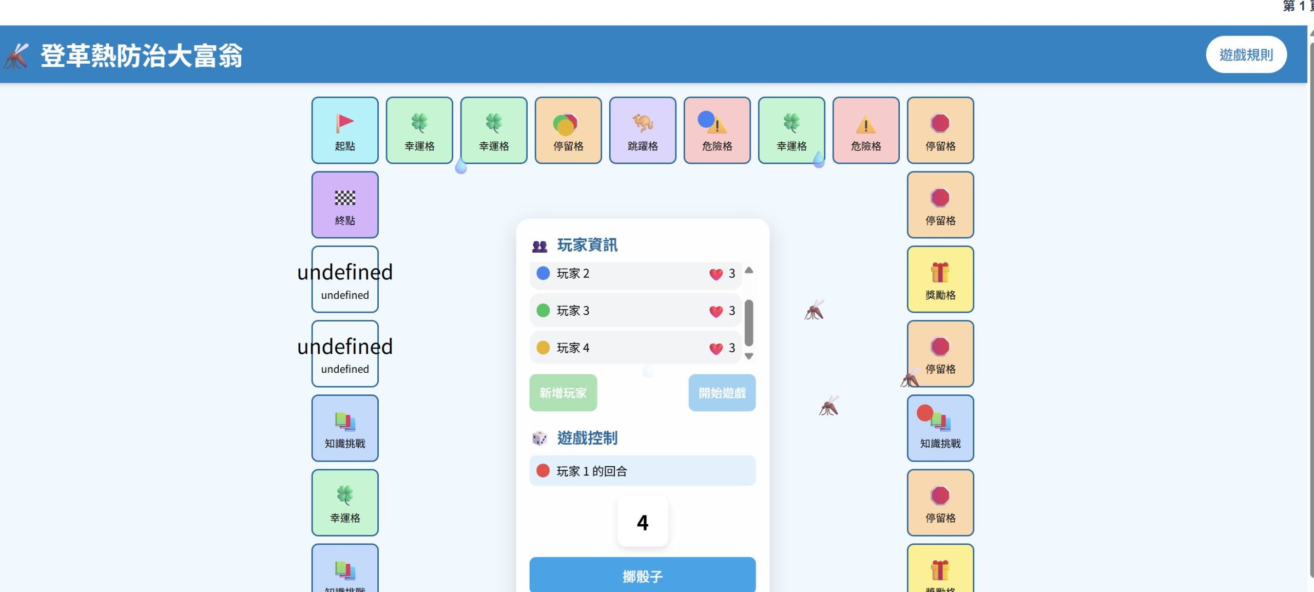 指令:我想設計一個大富翁遊戲給國小二年級學生玩,主題是關於登革熱