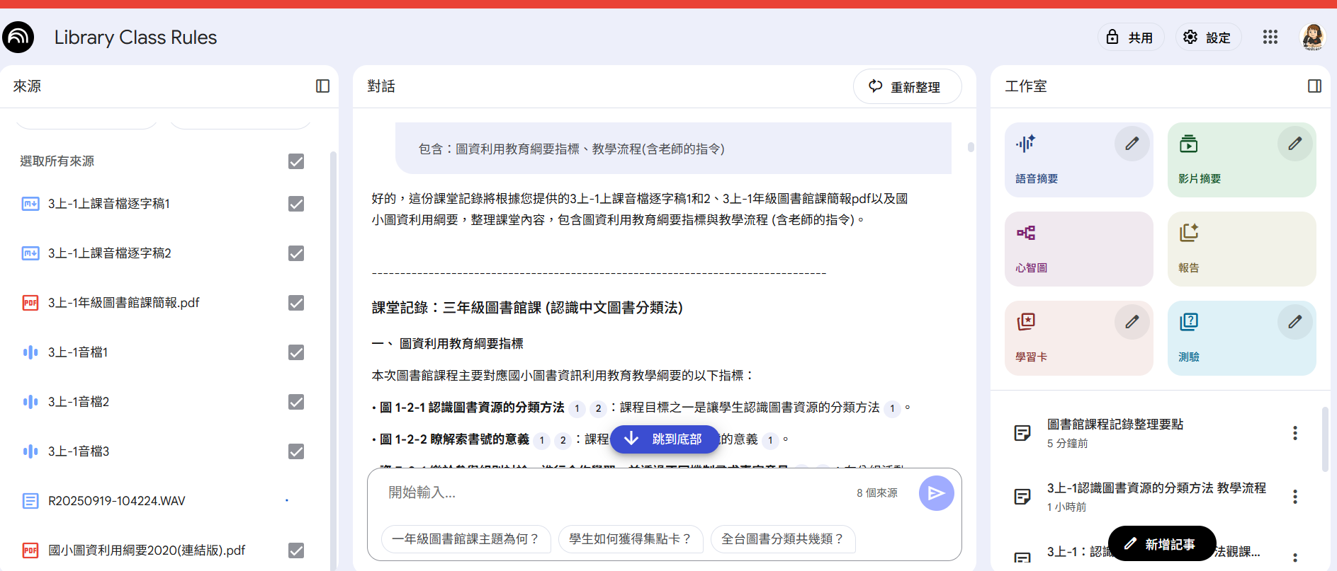 以下為NotebookLM產生的教師教學紀錄:三年級圖書館課 (認識中文圖書分類法)