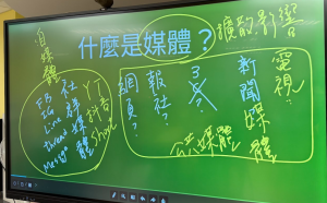 透過提問,將學生的回答寫在黑板上,最後歸納出媒體是什麼。最後導入這次要進行的是新聞媒體。