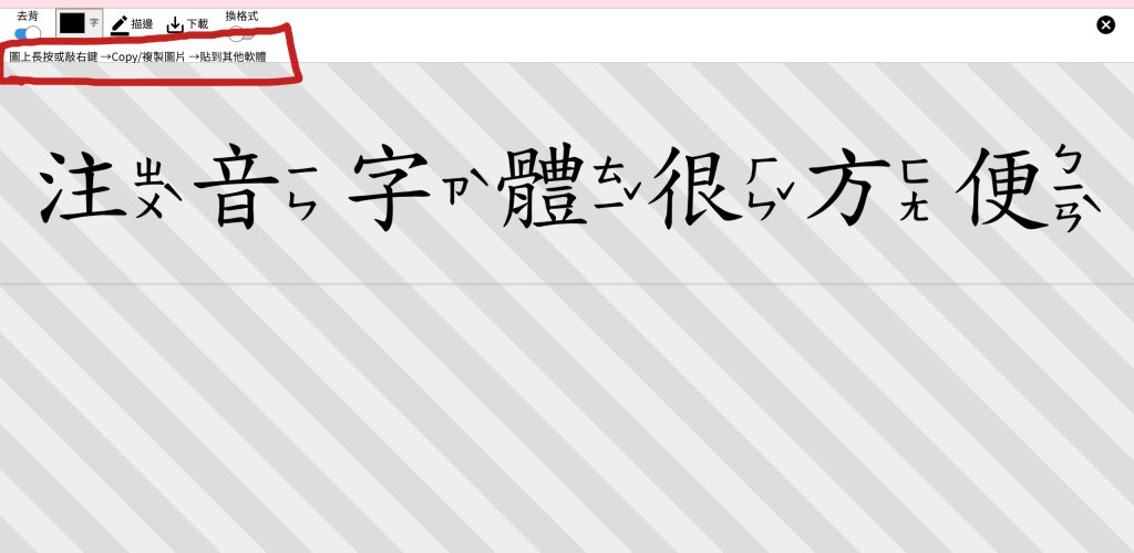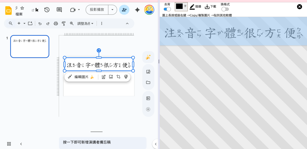 「注音字體」澳聲通快速製作有注音的文字211 月 2026今天跟教學組研究英文單字王要改版,改用google簡報來製作,第一個遇到的問題就是注音字體。我問了Gemini它介紹一個網站,只要輸入就直接產生注音字體,而且是直接去背的圖片檔,只要按一下就可以複製,到google簡報貼上,比在power point或是canva製作選字體還快速!超方便的!我看了一下介紹,這個網站是給華語教師使用的,所以有不同拼音系統。推薦給大家