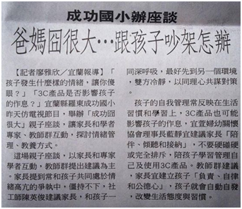 2013 成功冏很大Post author:715715Post published:2013 年 8 月 2 日Post category:家庭教育 / 親子講座 / 親職教育日期:102年6月8日地點:成功國小視聽室 玩很大,現場互動超棒。除了成功家庭教育種子教師團隊,合作無間,還有社會資源的幫助,感謝專家學者群:廖雅欣記者、陳英俊社工師和宜萱婦幼藍靜宜理事長,讓這樣活動得以成行,更棒是關心孩子的家長們,讓我們一起為孩子的幸福共同對話吧。 相關內容0913親師座談會2013 年 9 月 20 日社區民眾及家庭培養良好的休閒活動–國樂展演廳表演2013 年 2 月 4 日「慈孝家庭季–慈孝家庭楷模」選拔及表揚2013 年 5 月 31 日