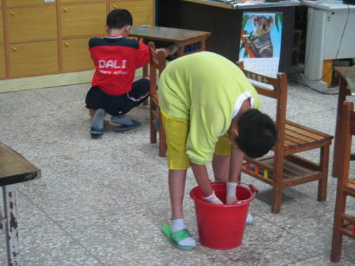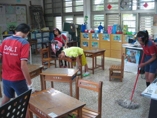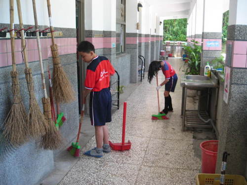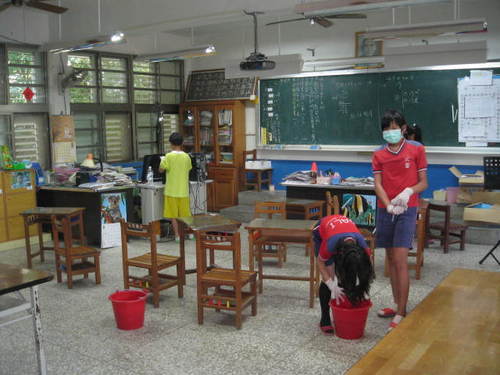 2009-05-07pm12:40班級教室(97下第十二次)打掃消毒2009 年 5 月 9 日2021 年 3 月 18 日 作者: t850667 分類: 五忠教與學【97學年度】、親師交流道【97學年度五忠】blank_page2009-05-07pm12:40班級教室(97下第十二次)打掃消毒最近由於各時段安排有其他活動,只好將「打掃消毒」異動 至星期四(05/07)中午的時間!這每週必做的事!大家執行起來已不陌生了![@more@]且現在又有H1N1新流感流行的疑慮!所以只能更加認真的進行「打掃消毒工作」! 這位先生的腳未免也挺得太直了!?還是小蓮工作時最認真!其次就算小美! 這位老兄,您拍照還擺姿勢!? 其他相關照片:2009-05-07pm12:40班級教室(97下第十二次)打掃消毒