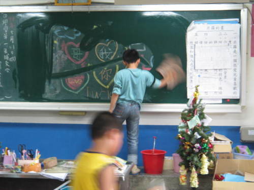 由於星期二校外教學、星期三補行學生朝會、星期四學校練習躲避球、…等之故,只好在此日進行消毒打掃。