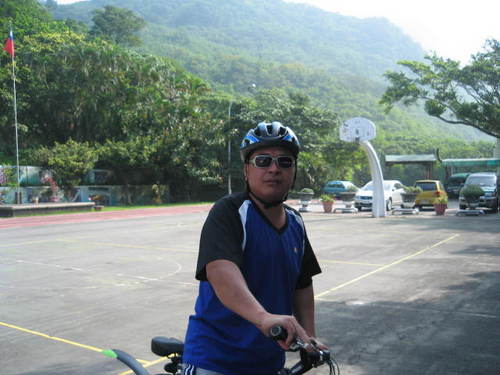 這天早上,在樓上教室內進行含氟潄口水[@more@](由於星期二是校外教學、星期三護士阿姨有事在忙之故,故延至星期四進行)的活動,走到走廊上洗手時,竟發現操場上有位裝備齊全且戴著墨鏡的腳踏車騎士對著我招手。