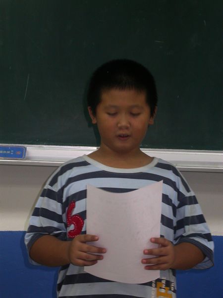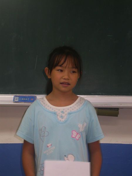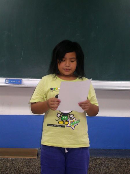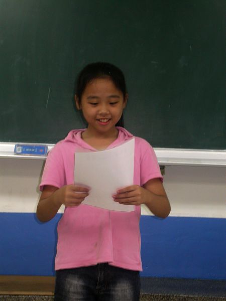 第二個活動請小朋友寫完大意後上台介紹,除了讓小朋友練習歸納重點,也讓小朋友用自己的話來介紹天公廟。一開始佳昕是笑笑的上台,也說了一兩句,但是太小聲,我們希望可以再大聲一點,但似乎對她來說(已經在台上了)有些難,她努力了一下下,哭了,其他的小朋友和我都有想請她回座的想法,但是,我們還是請她把剩下的部分唸完。不過,大家都覺得她有進步囉!所以票選活動的時候,她跟暄柔並列第一名。