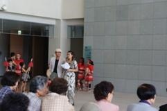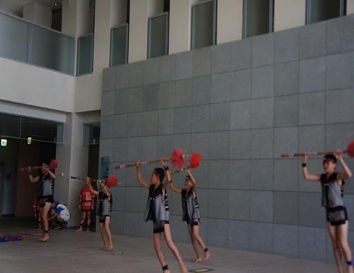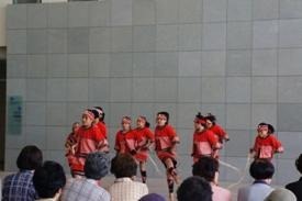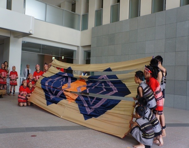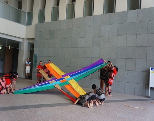 表演一開始,為了讓學生能夠足夠的時間放置道具,我們安排了魯木伊木伊老師說明舞蹈的內涵與劇情的解釋,另外也請劉教授在旁翻譯日語讓在場觀眾能夠聊解這次表演的內容,兩人雖沒有正式彩排過,不過現場主持的功力真是默契十足。表演之前,也可以看到莊老師不時地一邊告知學生注意的事項,一邊鼓勵學生大膽的跳出來,另外老師也在旁邊預備後續的處理動作。表演一開始由六位學生敲奏木琴組曲,由六首曲子交替混和而成的組曲,呈現不一樣木琴彈奏旋律。之後就是我們舞蹈的重點,第一段:泰雅族女性工作的情境,第二段:泰雅族男性狩獵與工作的狀況,第三段:泰雅族小朋友模仿大人工作收成的樣子第四段:呈現泰雅族織布之美。一開始學生跳舞與歌聲都還不錯,直到中段之後,就發現學生聲音略顯乾澀,學生動作也變得沈重,有學生說:「天氣很冷了!」我想天氣的因素讓學生表演時有些窒礙,不過整個表演都還在水準之上,沒有失誤的演出,可以看出學生認真表演的態度,這份認真打動了在場的每一位嘉賓,他們已熱烈的掌聲回饋了我的精采的表演,但是,我們由衷的希望他們能知道在台灣還有一個原住民美麗的文化。