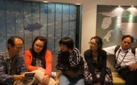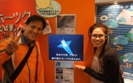 進入鄂霍次克流冰館前,每個人輪流排隊取票,聽超美麗正妹解說員的解說,雖然她說的是日文,但是我們大概都可以亂猜,在一旁的劉教授,很仔細的幫我們解說,能近距離看到摸到流冰,真的是一個很新鮮也很開心的體驗。