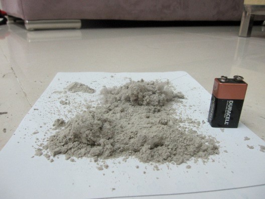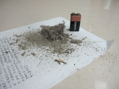 看不出來有多少嗎?我把灰塵棉絮倒出來,旁邊放上一顆電池,你就可以知道4個月後的沙發竟然有這麼多灰塵棉絮。