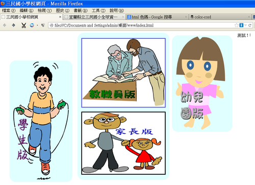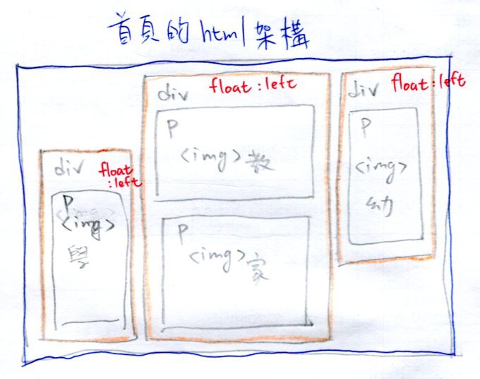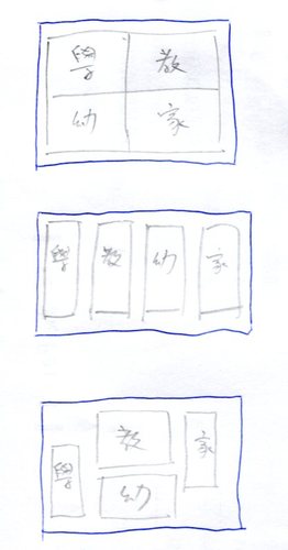 今天宣霖、啟宏走了之後,花了一些時間,趕工完成的。跟原先的設計稍稍有了些不同,圖都是從Openclipart中撈出來的,沒有侵權的問題。[@more@]原本心中想的首頁呈現方式是下圖的圖一。不過也有想過,或許可以像圖二,用並排的方式來處理。但最後因為從Openclipart找出來「合適」的圖,並不是每一張都是長條的長方形或是正方形,所以變通的方式就是以圖三的形式來呈現。暫時的現況。