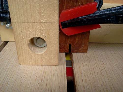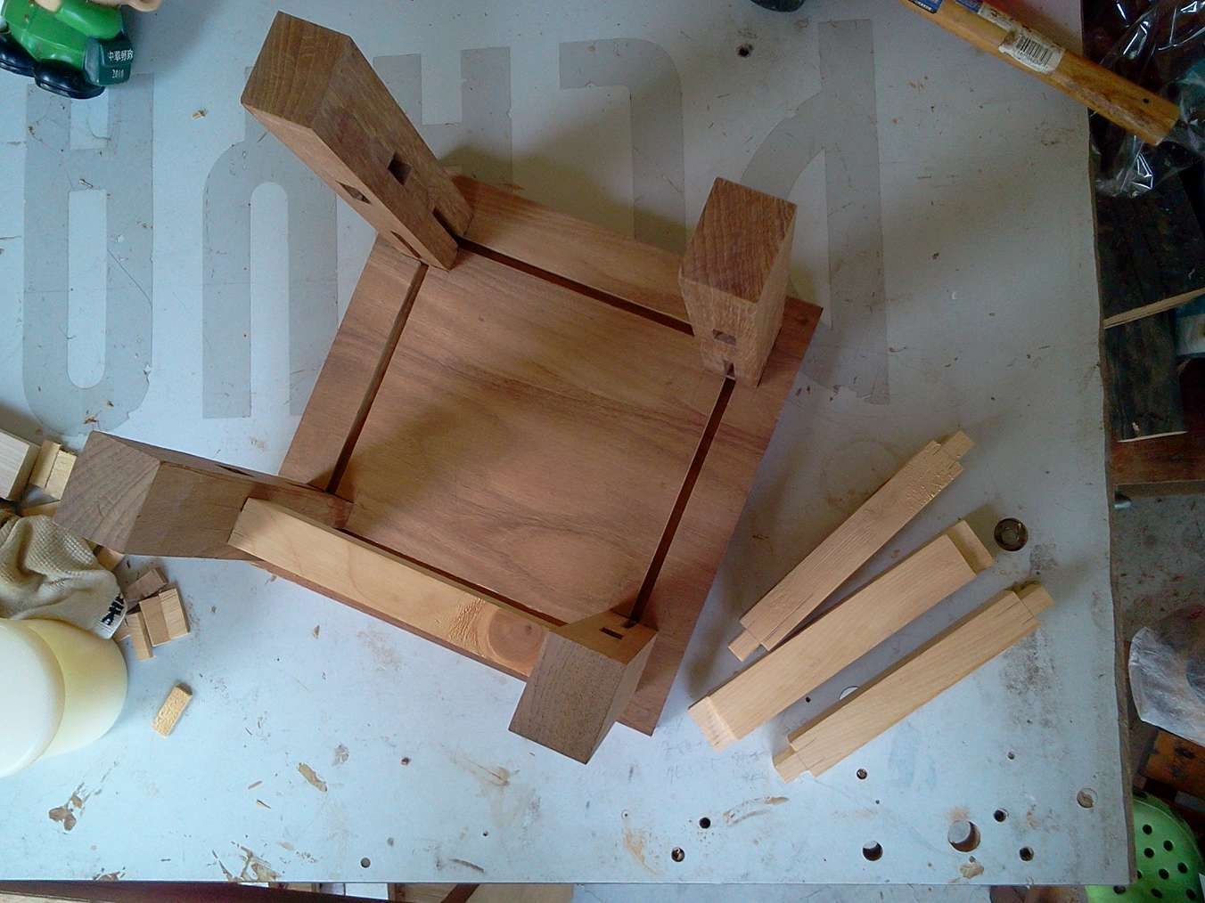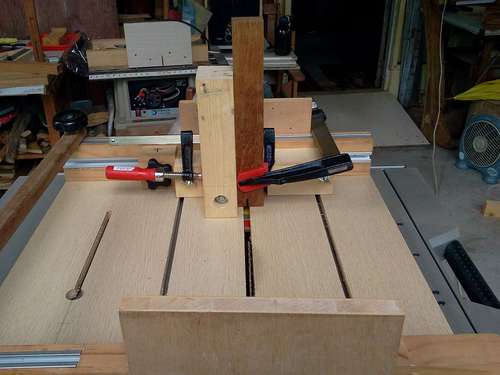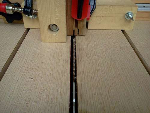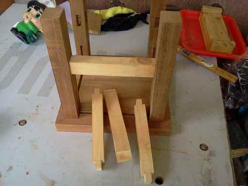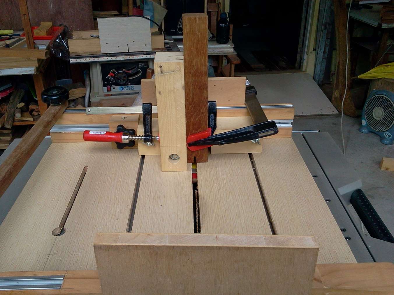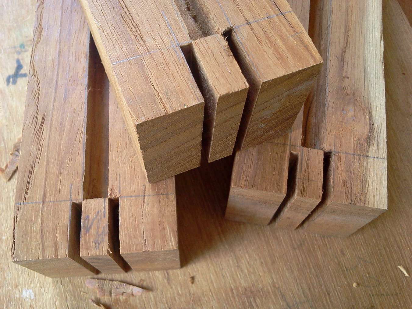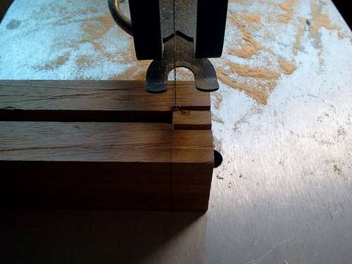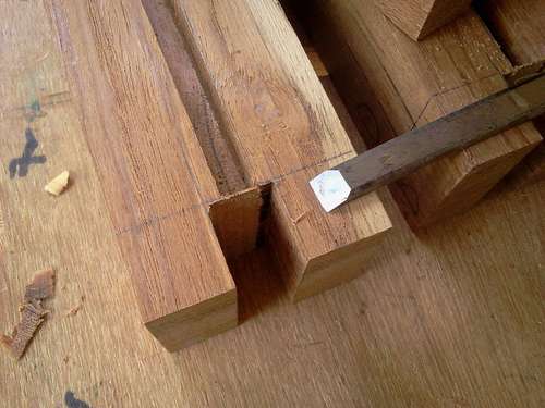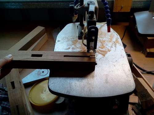 這個作品拖得有點久,其實都快完工了,只是開學忙呀![@more@]這次還是要弄榫頭是,只是上次的是製作橫撐的兩端榫頭,這次是來製作椅腳的榫頭。一樣是用圓鋸機的全推台來切割椅腳的榫頭。 切出兩邊。 中間是要除去的地方。 使用的是線鋸機。 使用線鋸機初步切割厚的成果。 再用修鑿來做細部的修整,這樣椅腳的榫頭算是完成了。 可以試著先組裝一下。