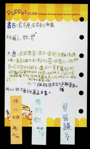 林潔的好書推薦-長襪皮皮到南島(~97.12~)Post author:連振翔Post published:2009 年 1 月 27 日Post category:同儕好書推薦區推薦書籍名稱:長襪皮皮到南島 推薦過程影片 推薦單與閱讀者相關內容以珊的好書推薦-愛心動物醫院(~98.03~)2009 年 4 月 2 日佑儒的好書推薦-血的寓言(~98.03~)2009 年 3 月 26 日梓恆的好書推薦-蘋果冒險3(~98.11~)2010 年 2 月 1 日