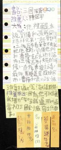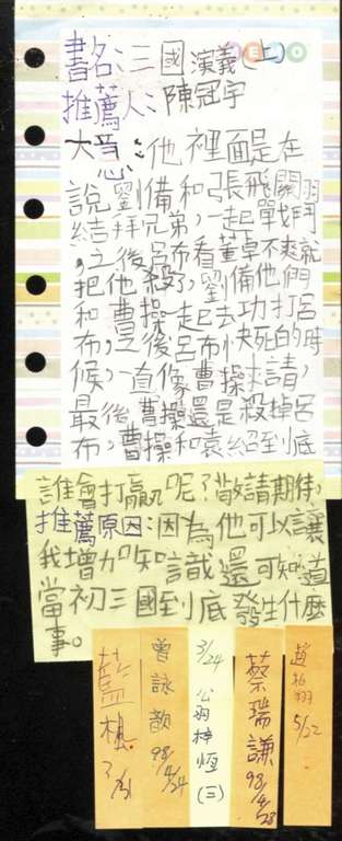 冠宇的好書推薦-三國演義(~98.03~)Post author:連振翔Post published:2009 年 3 月 25 日Post category:同儕好書推薦區推薦書籍名稱:三國演義推薦過程影片 推薦單與閱讀者 相關內容瑞謙.梓恆.冠宇.竣凱的好書推薦(~99.03~)2010 年 3 月 23 日育齊.東晉.奕翔.慧晴的好書推薦 (~99.03~)2010 年 4 月 2 日穿條紋衣的男孩-冠宇(~97.09~)2008 年 10 月 2 日
