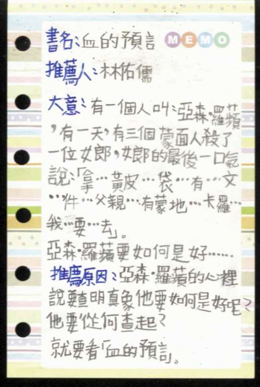 佑儒的好書推薦-血的寓言(~98.03~)Post author:連振翔Post published:2009 年 3 月 26 日Post category:同儕好書推薦區推薦書籍名稱:血的寓言推薦過程影片 推薦單與閱讀者 相關內容欣慧的好書推薦-震不碎的愛(~98.11~)2009 年 12 月 4 日慧晴的好書推薦-乞丐囝仔(~98.03~)2009 年 5 月 10 日品耘的好書推薦-地球‧宇宙‧我們的家(~97.12~)2009 年 1 月 27 日