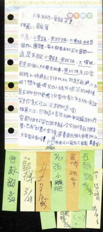 宛蒨的好書推薦-六年五班愛說笑!(~98.03~)Post author:連振翔Post published:2009 年 4 月 5 日Post category:同儕好書推薦區推薦書籍名稱:六年五班愛說笑!推薦過程影片 推薦單與閱讀者 相關內容藍楓的好書推薦-地名的故事(~98.05~)2009 年 5 月 6 日詠歆的好書推薦-蘋果冒險2(~98.11~)2009 年 12 月 9 日品耘的好書推薦-畫框裡的秘密(~98.05~)2009 年 5 月 5 日