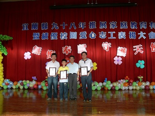 宜蘭縣98年績優校園志工表揚作者:黃俊仁2009 年 9 月 28 日2021 年 3 月 18 日宜蘭縣98年績優校園志工表揚學校推薦 董俊德 會長 、黃木清 副會長、 劉春詳 先生 等三位校園愛心志工代表接受縣長表揚。對於全體志工對學校熱心無私奉獻,讓學校能夠更安全、更溫馨、更有活力,在此致上最誠摯的謝意。