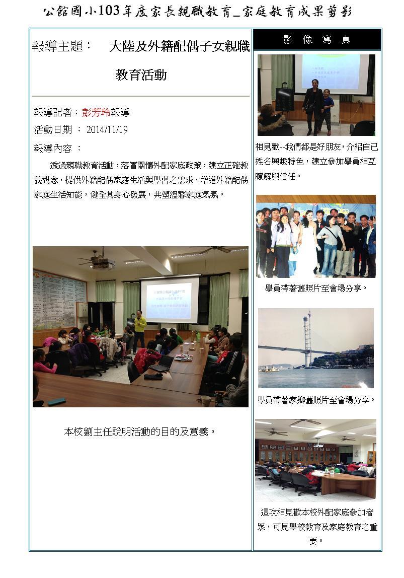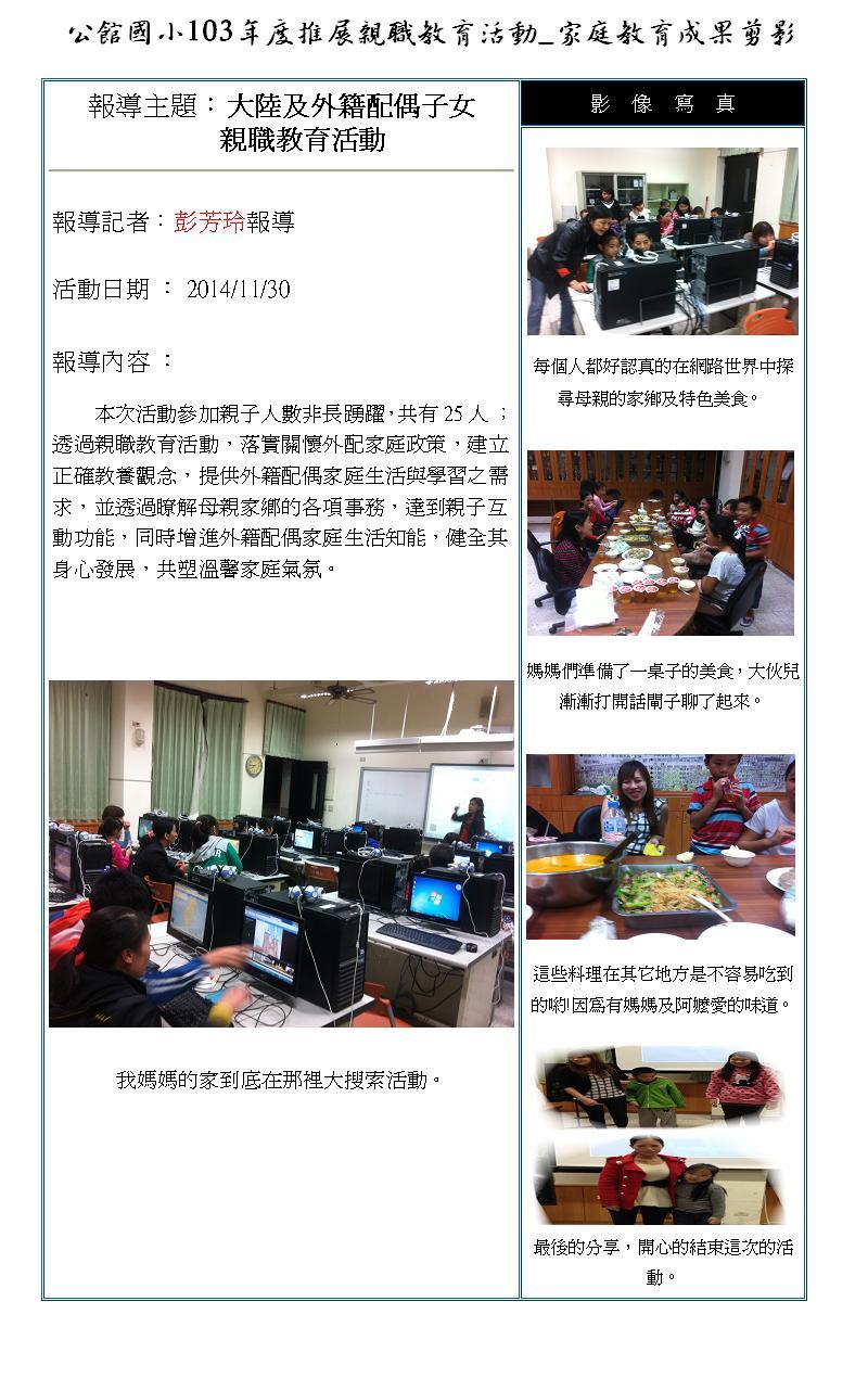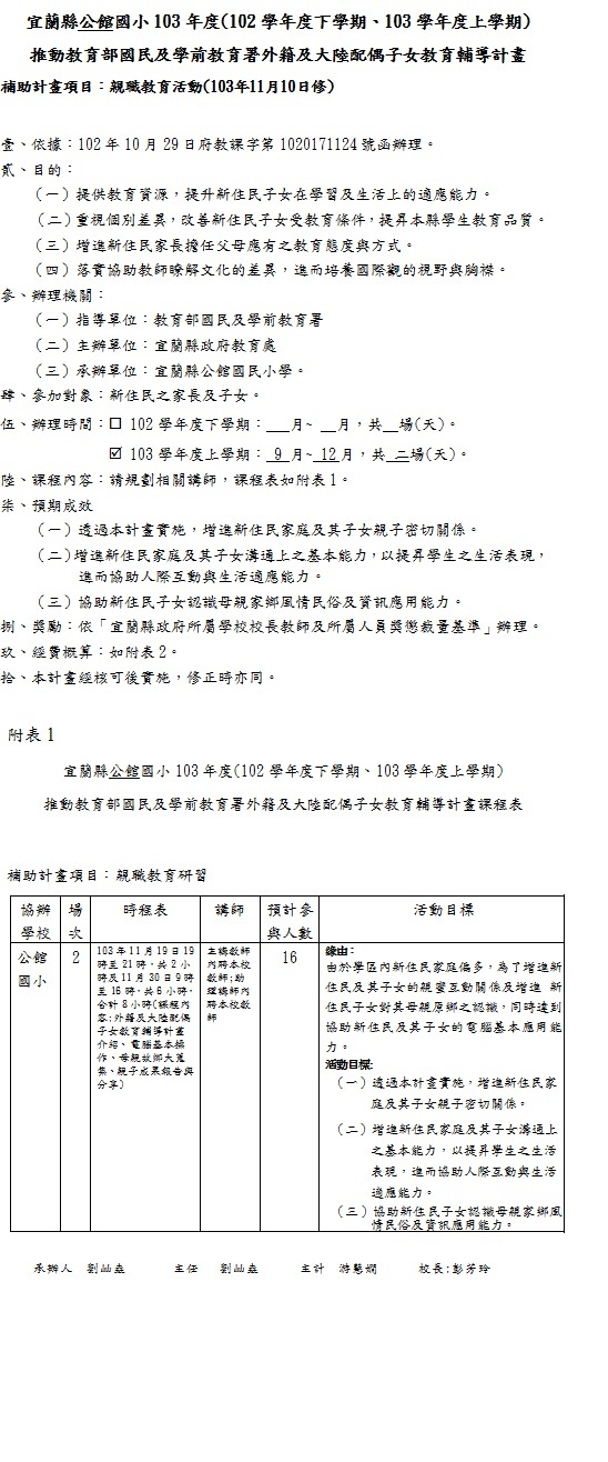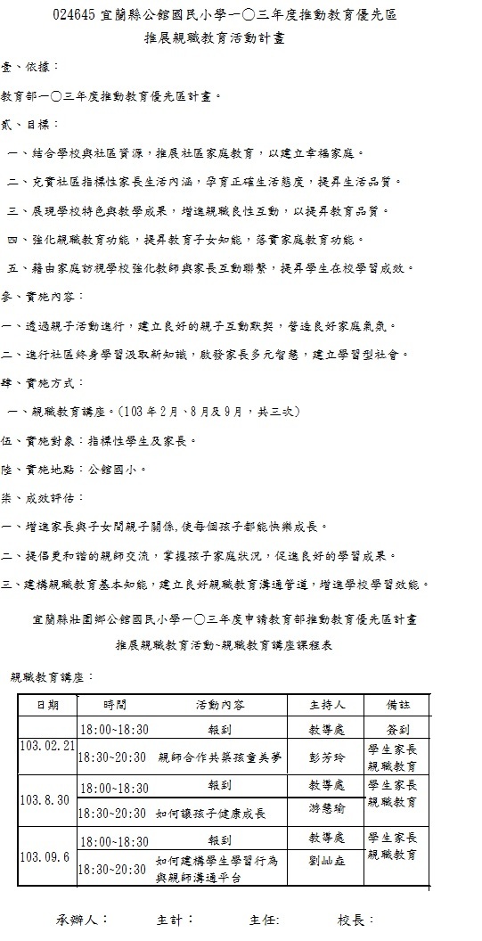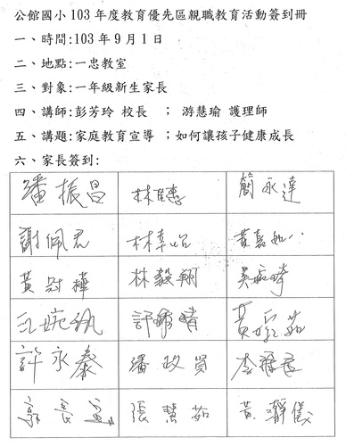發佈於 2014 年 12 月 23 日103年度公館國民小學推展家庭教育成果自評表https://view.officeapps.live.com/op/embed.aspx?src=http%3A%2F%2Fblog.ilc.edu.tw%2Fblog%2Fgallery%2F16762%2F16762-2902199.doc