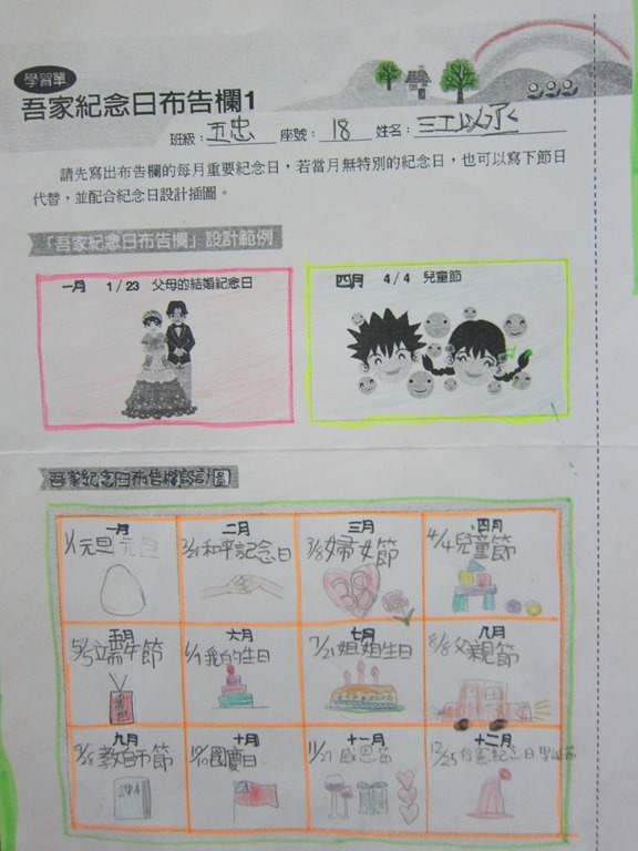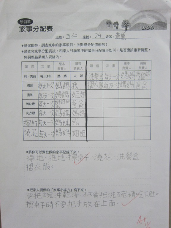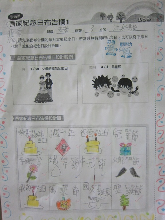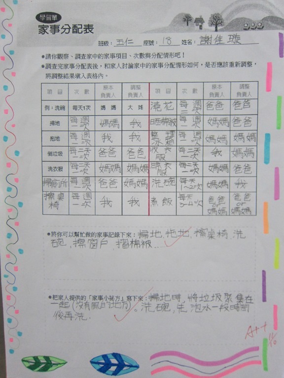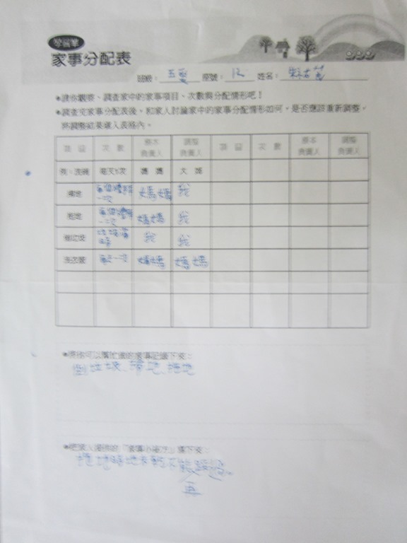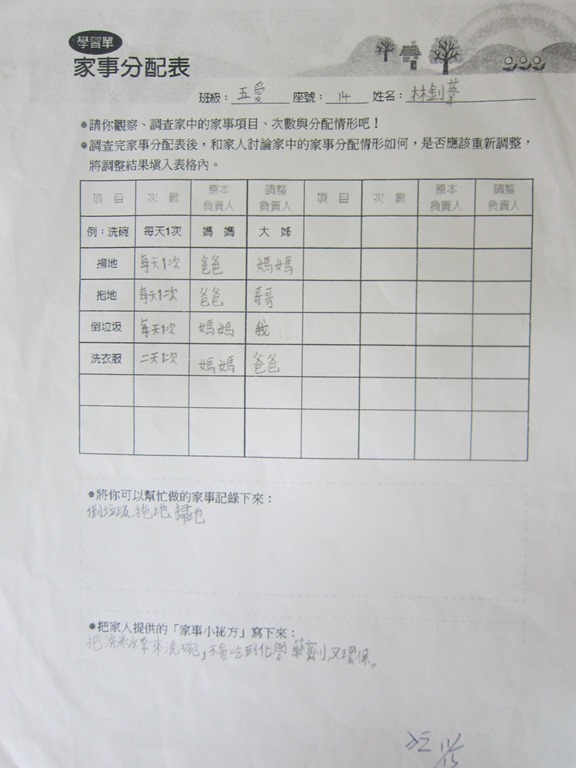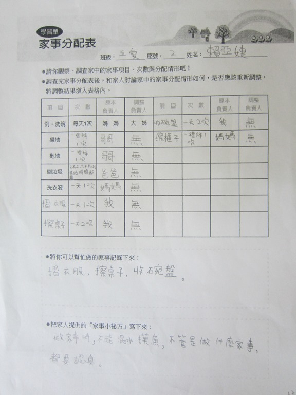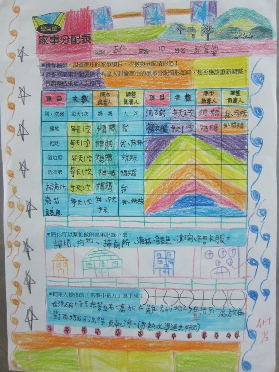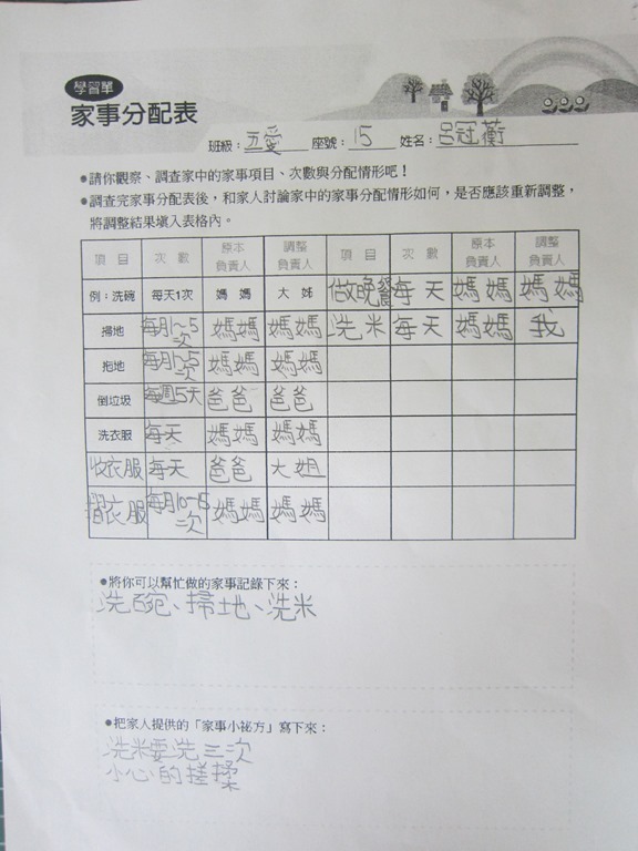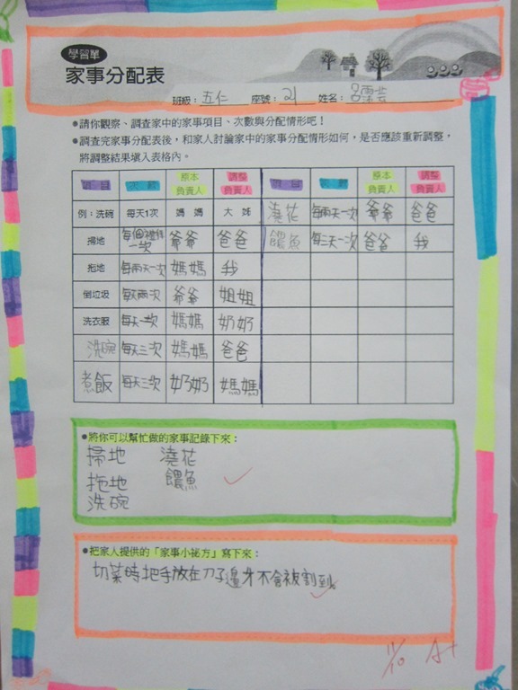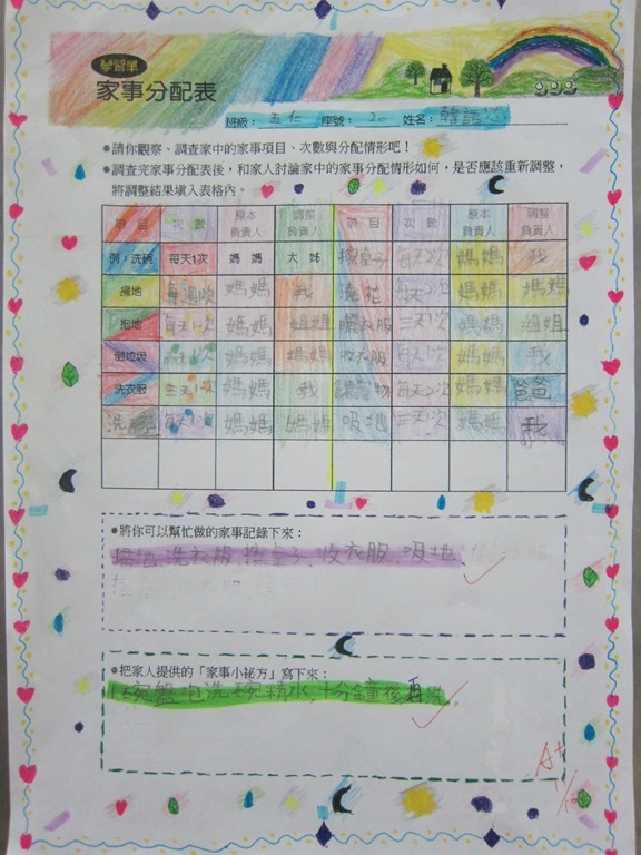 1-1-2 五年級4小時家庭教育課程作者:moonj2014 年 11 月 21 日2021 年 3 月 18 日活動日期:103年10-11月活動對象:5年級活動時數:4小時活動內容:1.吾家吾日佈告欄: 寫出佈告欄裡每月的重要日 ,並配合重要日設計插圖 。 2.家事分配表:和家人討論家是分配表,是否該重新調整,將調整後的家事分配情形紀錄下來。