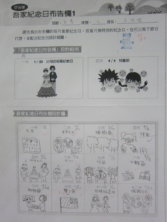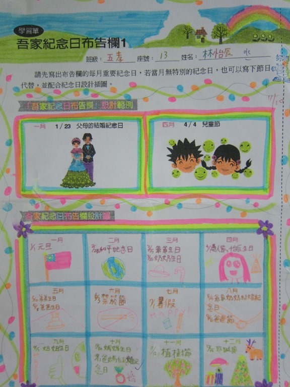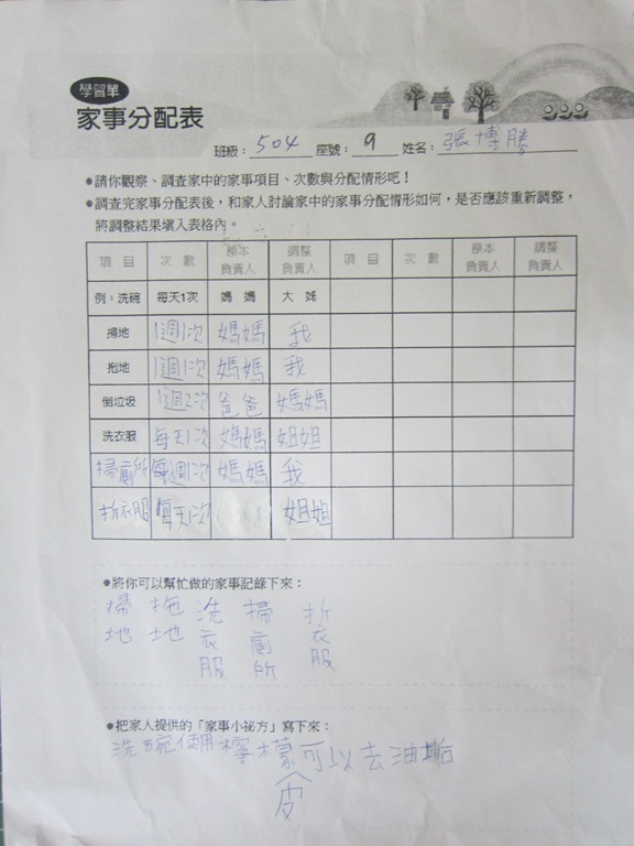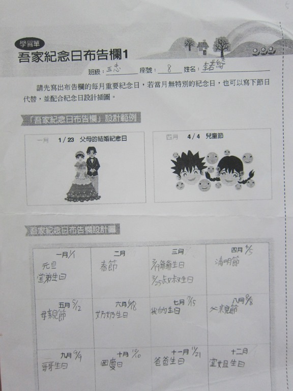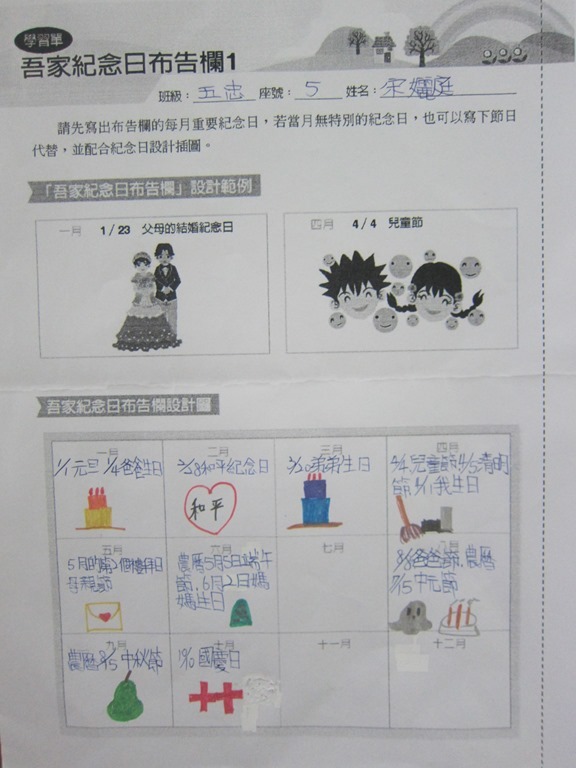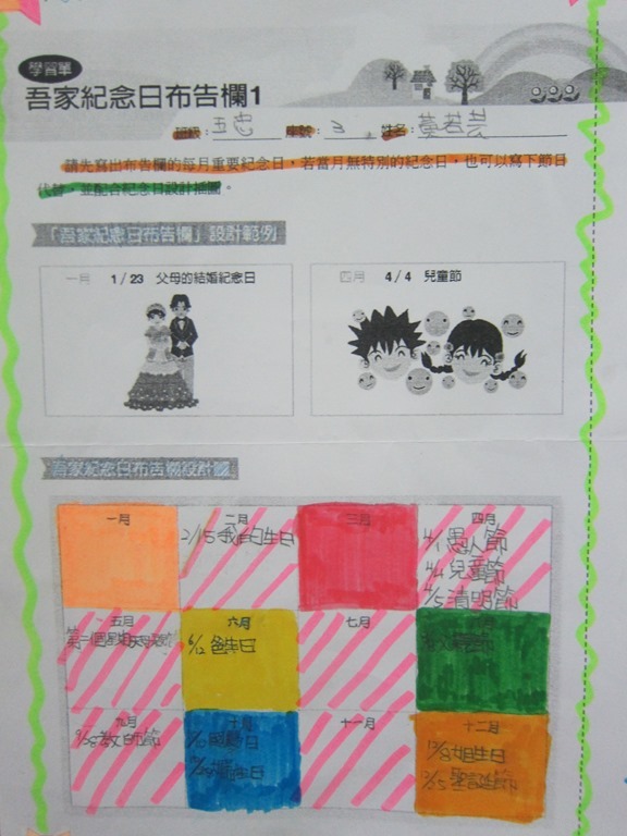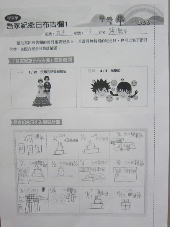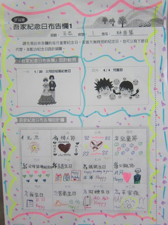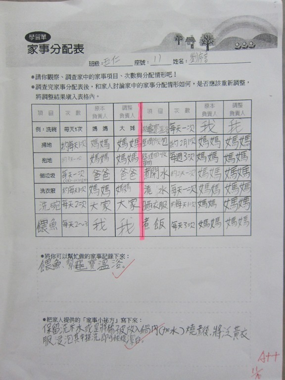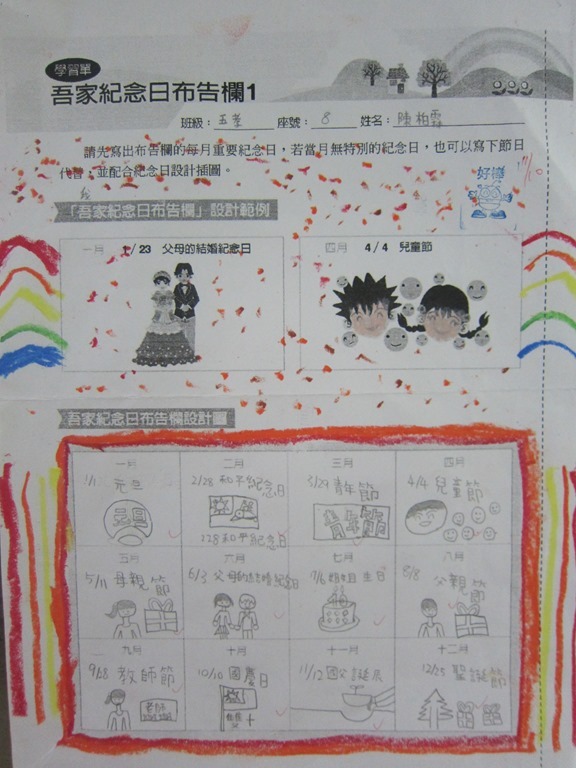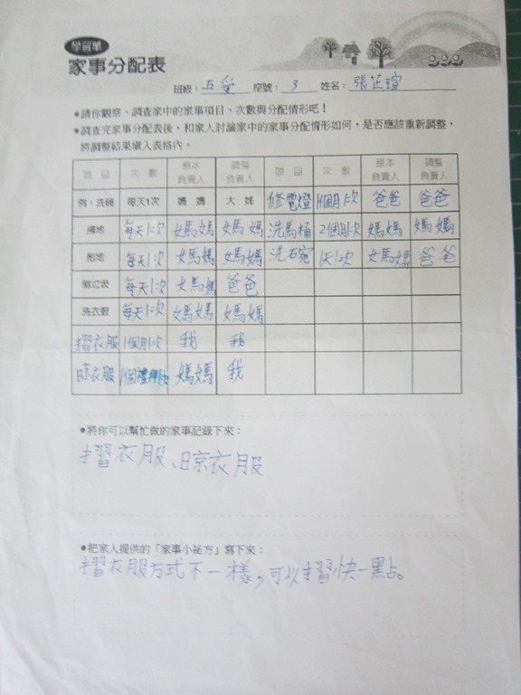 1-1-2 五年級4小時家庭教育課程作者:moonj2014 年 11 月 21 日2021 年 3 月 18 日活動日期:103年10-11月活動對象:5年級活動時數:4小時活動內容:1.吾家吾日佈告欄: 寫出佈告欄裡每月的重要日 ,並配合重要日設計插圖 。 2.家事分配表:和家人討論家是分配表,是否該重新調整,將調整後的家事分配情形紀錄下來。