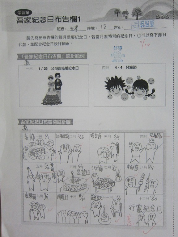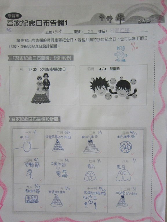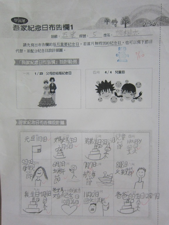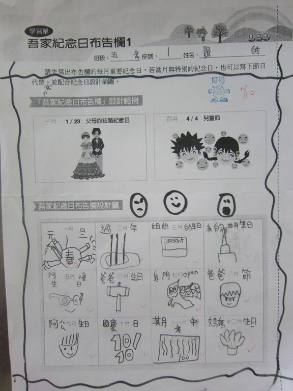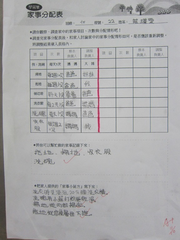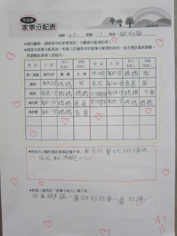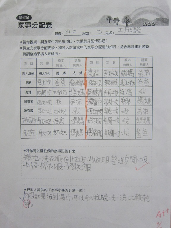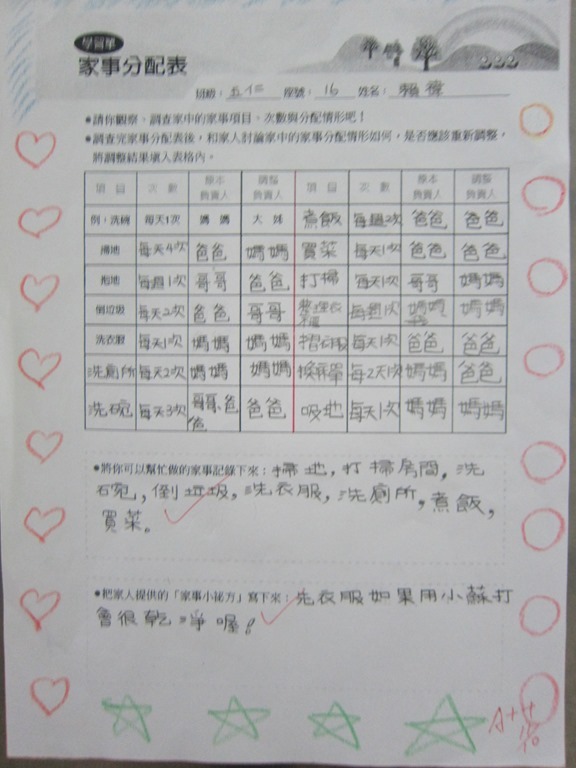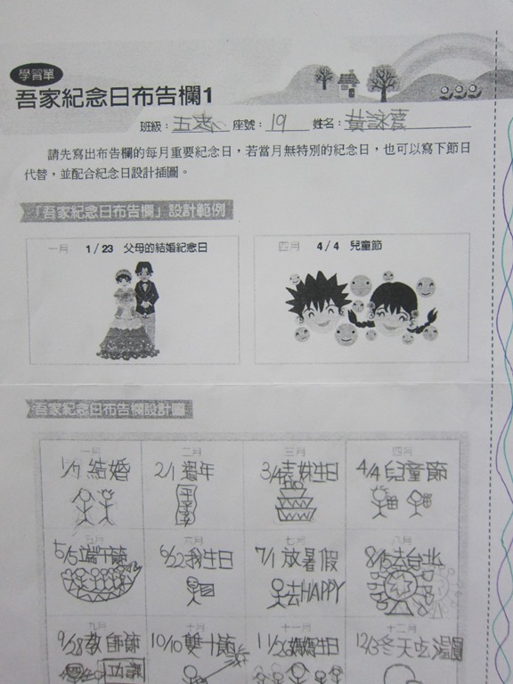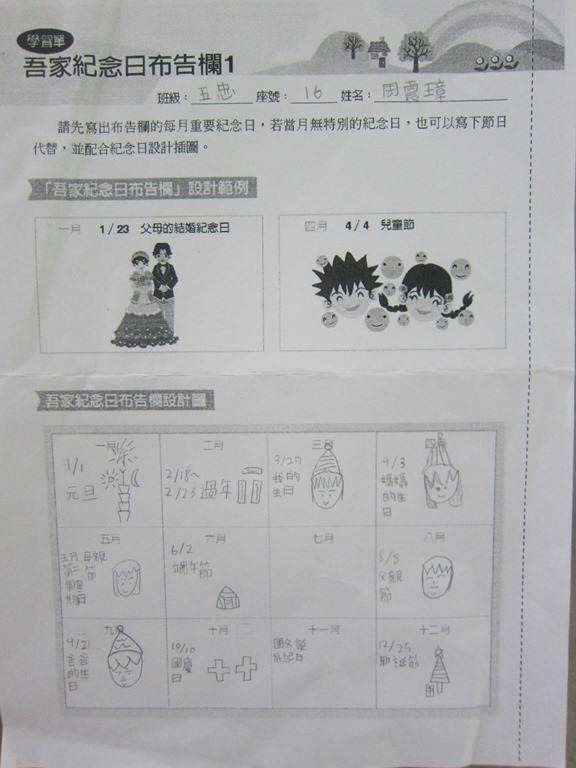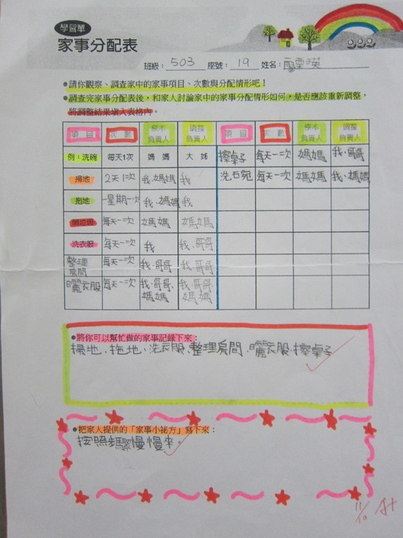 1-1-2 五年級4小時家庭教育課程作者:moonj2014 年 11 月 21 日2021 年 3 月 18 日活動日期:103年10-11月活動對象:5年級活動時數:4小時活動內容:1.吾家吾日佈告欄: 寫出佈告欄裡每月的重要日 ,並配合重要日設計插圖 。 2.家事分配表:和家人討論家是分配表,是否該重新調整,將調整後的家事分配情形紀錄下來。