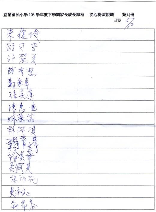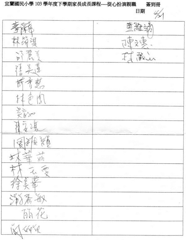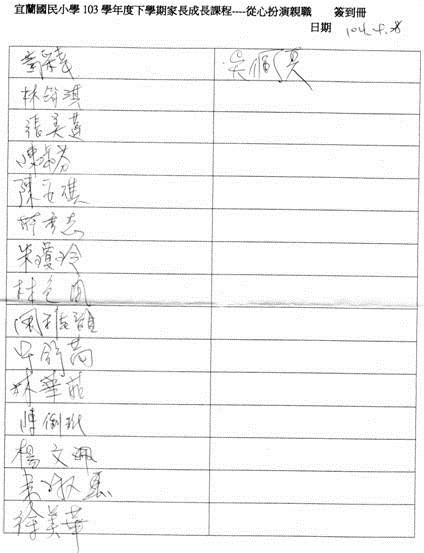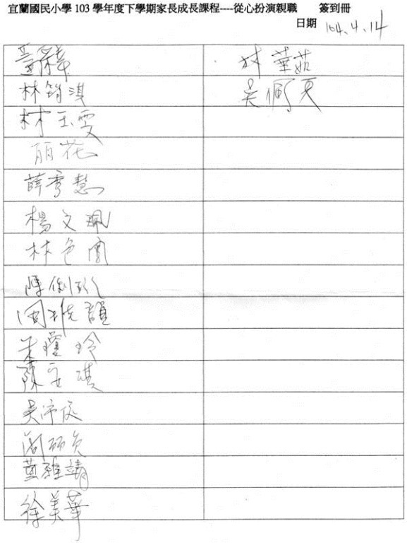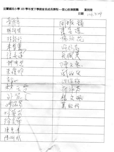 宜蘭國小家長成長班回饋單 及簽到冊 104.4.14