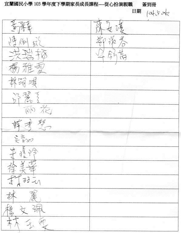 宜蘭國小家長成長班回饋單 及簽到冊 104.05.26