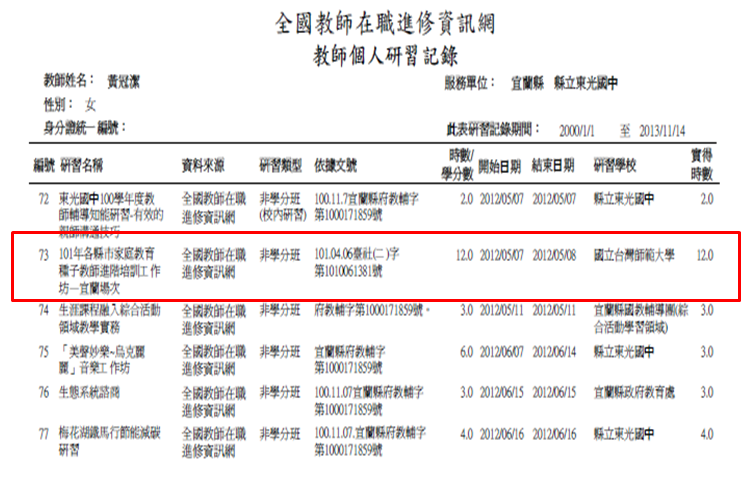 家庭教育種子教師培訓名單Post author:歐育如Post published:2012 年 11 月 14 日Post category:03家庭教育活動東光國中參加家庭教育種子教師培訓名單 99年:陳君蘭老師、黃冠潔老師 101年:黃冠潔老師 相關內容103_3-1-1溫馨家庭歌詞創作比賽及成果MV2014 年 12 月 8 日101.05.11溫馨五月‧鮮花傳情2012 年 11 月 25 日103_3-1-1寒假家庭教育活動「真愛家庭季 尋找家庭記憶」2014 年 11 月 30 日