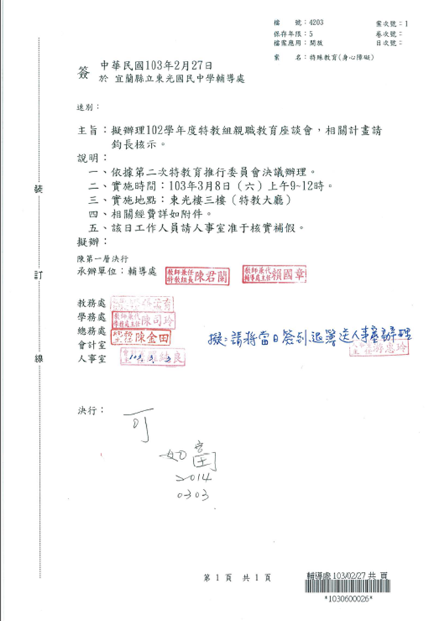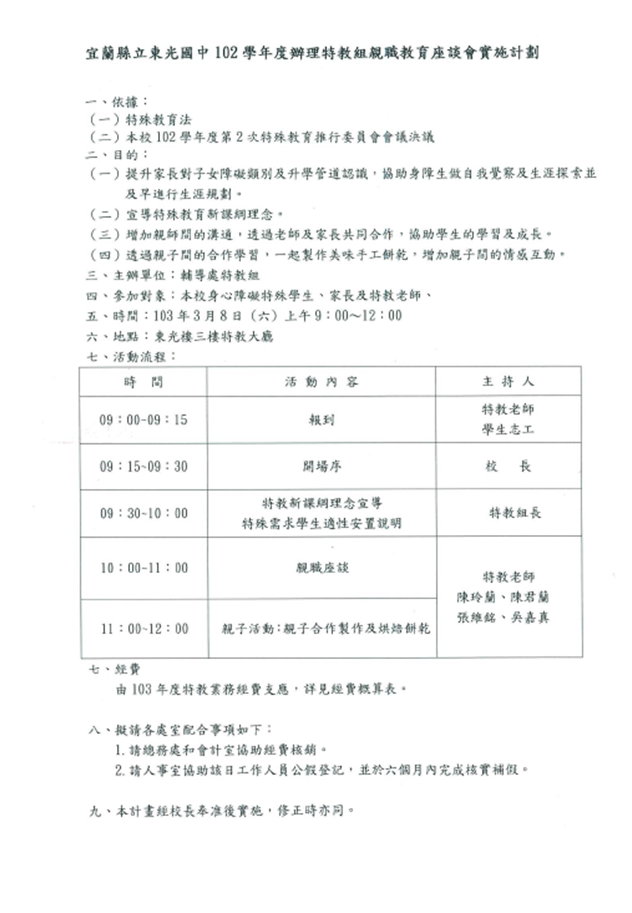 | 活動名稱:特教組親職教育座談會 辦理日期:103.03.08(星期六) 舉辦地點:特教大廳 參加對象:本校特殊需求學生家長 活動說明:邀請特殊需求學生家長到校說明適性安置與多元入學管道,並特別安排點心製作課程,增進親子互動。 | |
