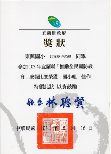 四忠學生 邱宜婷 朱巧榆 榮獲103年宜蘭縣推動全民國防教育壁報比賽榮獲佳作作者:黃俊仁2014 年 5 月 26 日2021 年 3 月 18 日四忠學生 邱宜婷 朱巧榆 榮獲103年宜蘭縣推動全民國防教育壁報比賽榮獲佳作 103.05.16指導教師 游原一