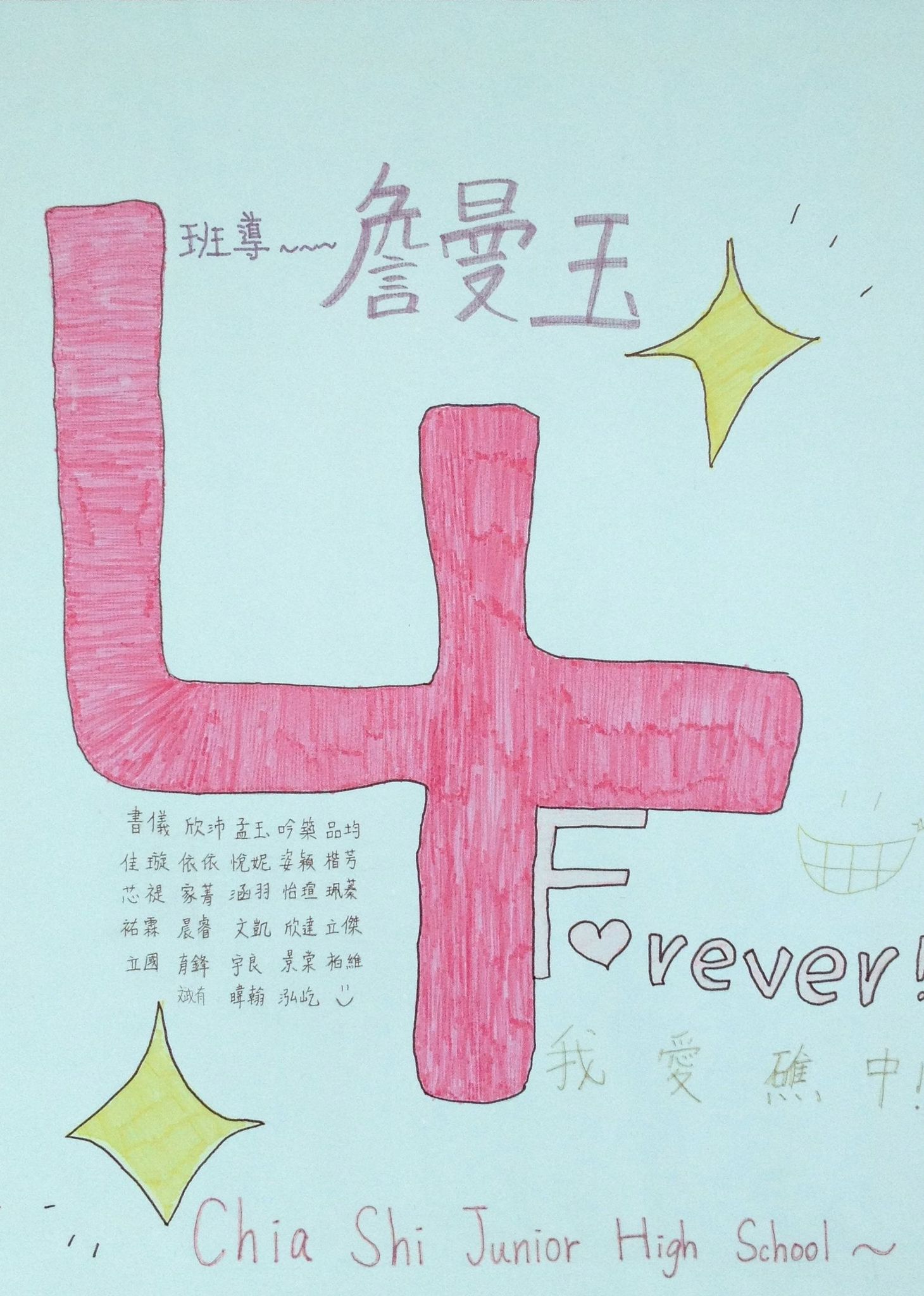 正面➜因班上是4班➜英文four➜forever➜4班下有所有班上成員姓名。
