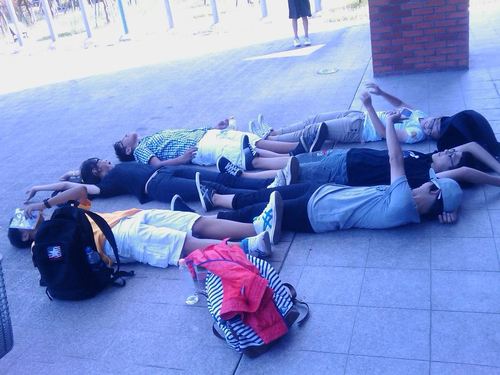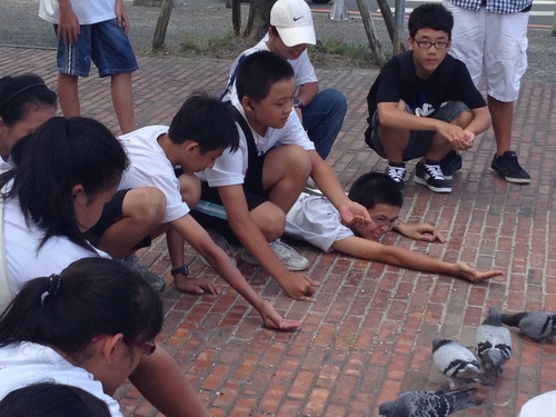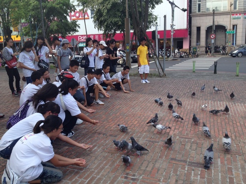 到宜蘭火車站對面廣場休息,確有著意外插曲,原來那廣場也有如同巴黎或倫敦等廣場,如詩般的悠閒與美麗畫面,鴿子從四面八方飛至廣場,學生也開心享受餵食鴿子之樂,不知學生想法是什麼,但我確有一種放鬆與幸福之感。哇噻!宜蘭也可以如此悠閒呢!想像著,在異國之景象!呵