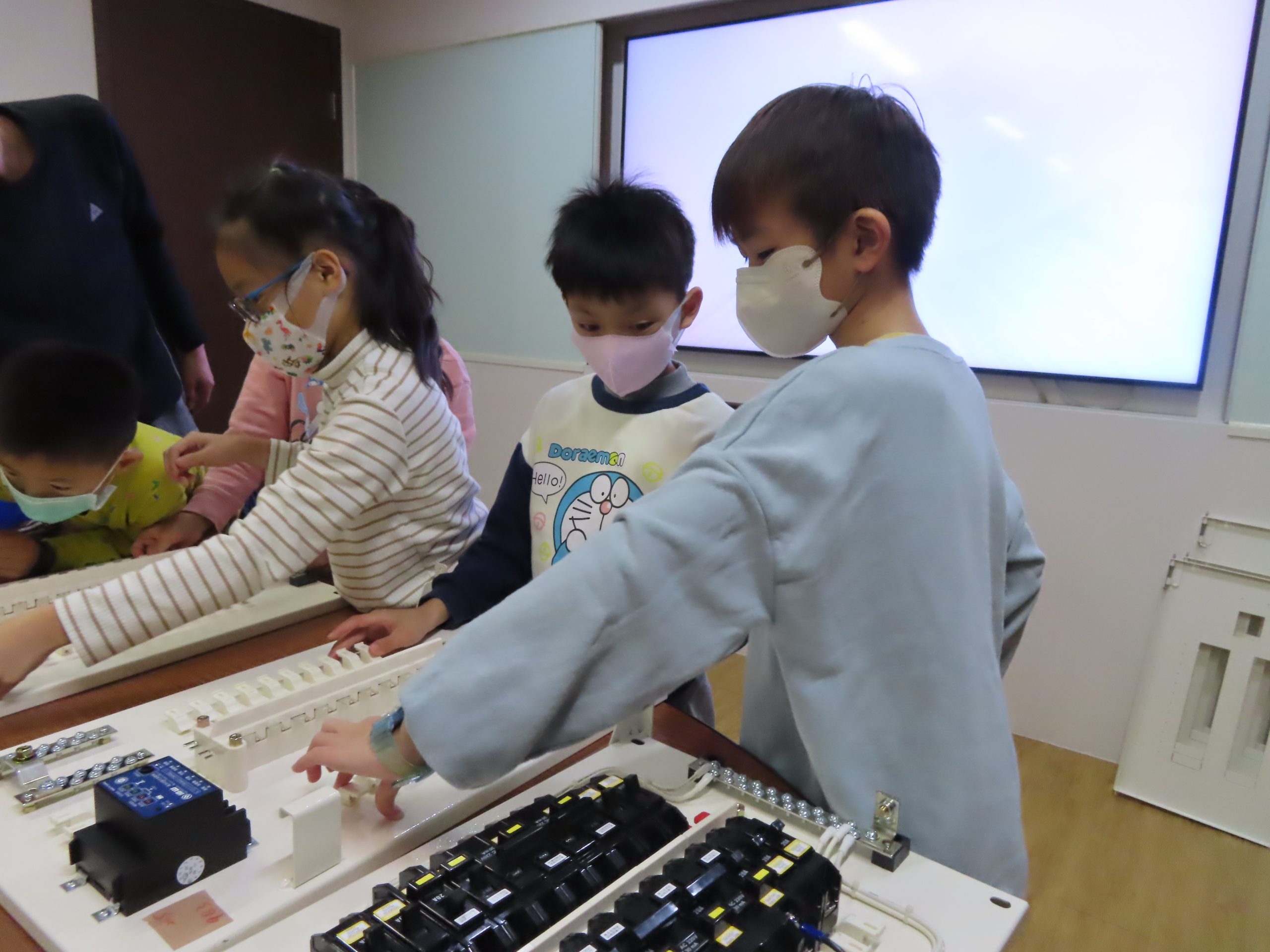 小斌媽媽用最淺顯易懂的方式,向我們解釋了配電箱就像是建築物的心臟,負責分配電力、保護電路安全的重要性。孩子們學會了如何分辨總開關、分路開關、漏電斷路器等關鍵元件,理解了它們在居家安全工業運作中的重要功能。