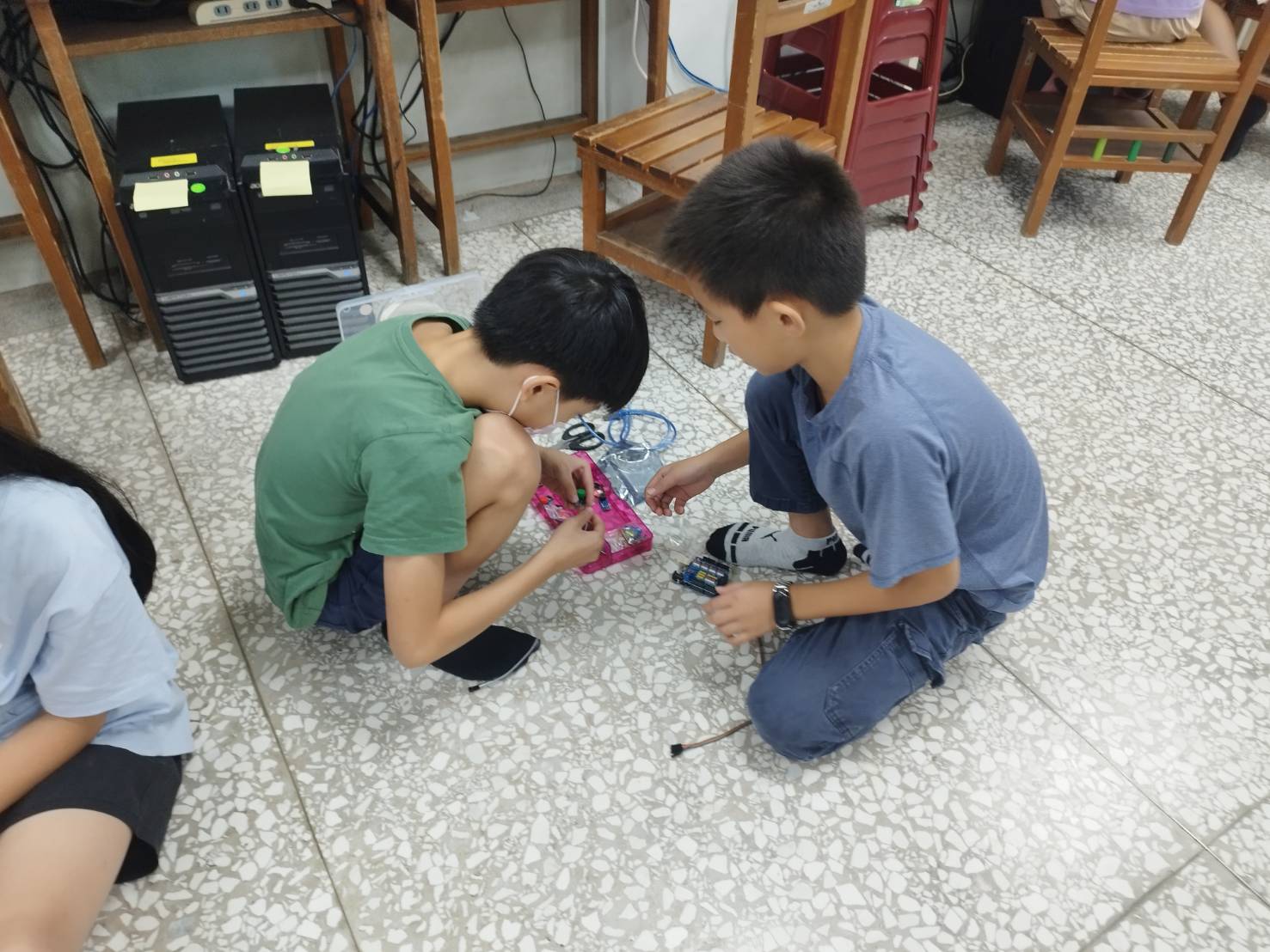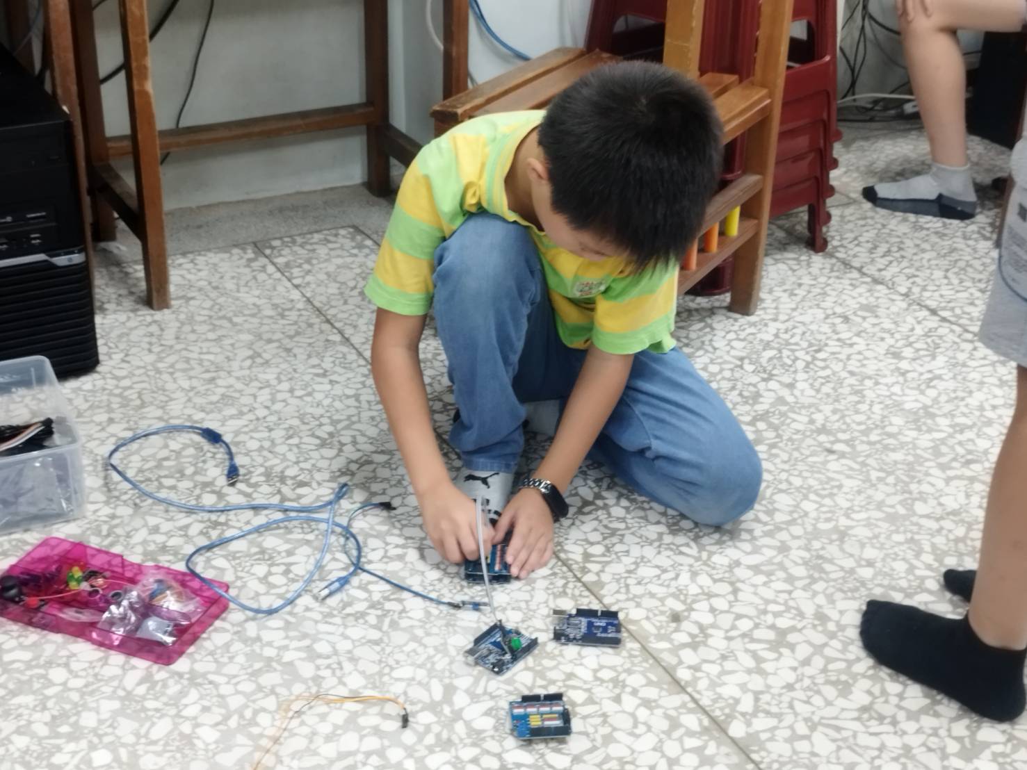 重頭戲登場!我們拿出資優班的「秘密武器」—— Arduino控制器和光敏電阻!孩子們親手將電子零件接上電路板,寫下簡單的程式碼,把一堆冰冷的零件變成了一個能「測量光線」的儀器。