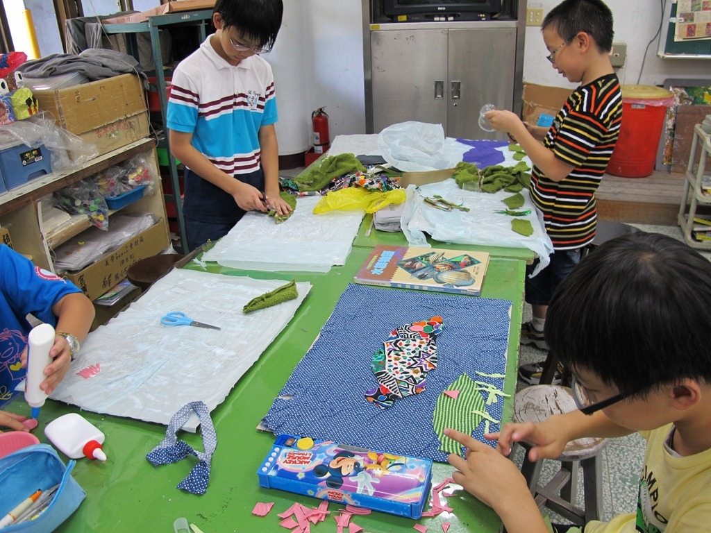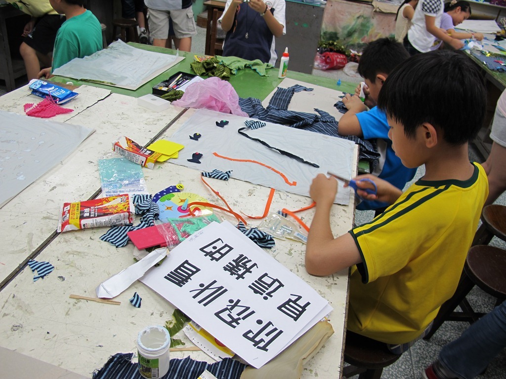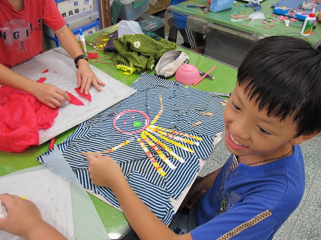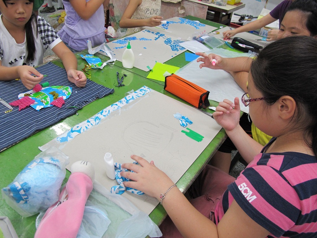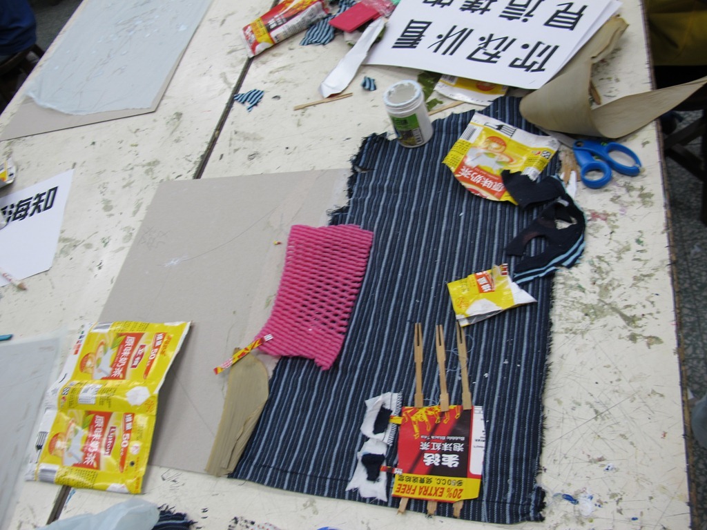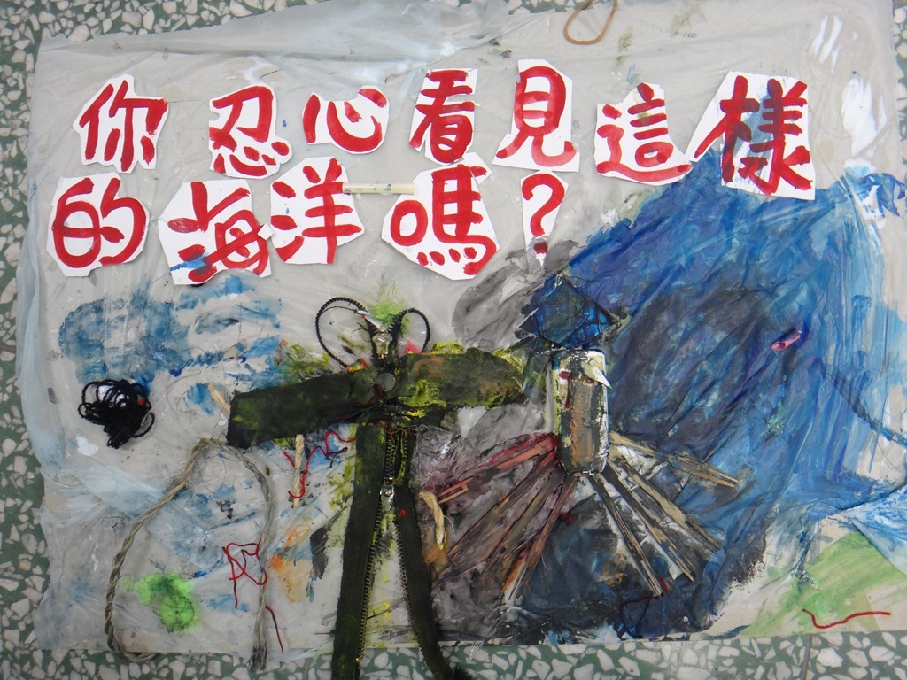 訂定正反兩種海洋宣導標語:「愛海 親海 知海,永續 環境資源」、「你忍心看見這樣的海洋嗎?」,用白膠拼貼現成物,希望學生帶廢棄物,結果大部分還是老師帶不穿的衣服,塑膠餐盒、吸管塑膠袋、72色票色紙、洗乾淨的鋁箔包、竹叉子、氣球、裝水果的網、彩球、中國繩、珠子、麻繩等,翻遍教室剩餘的材料。