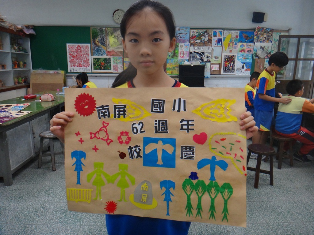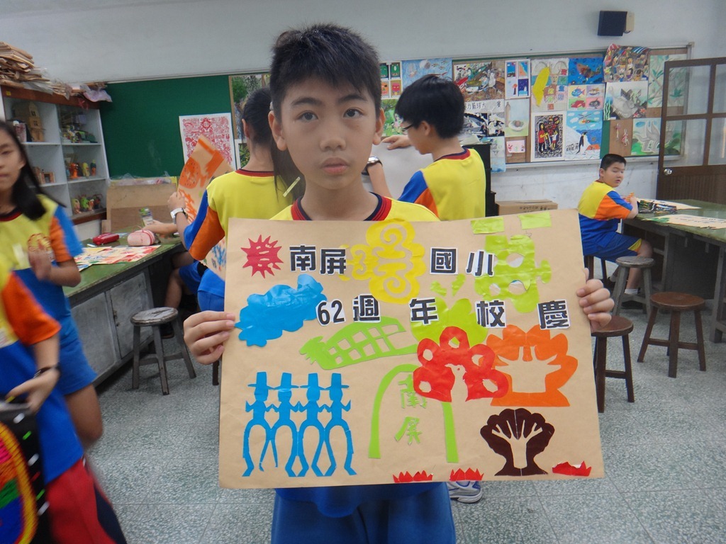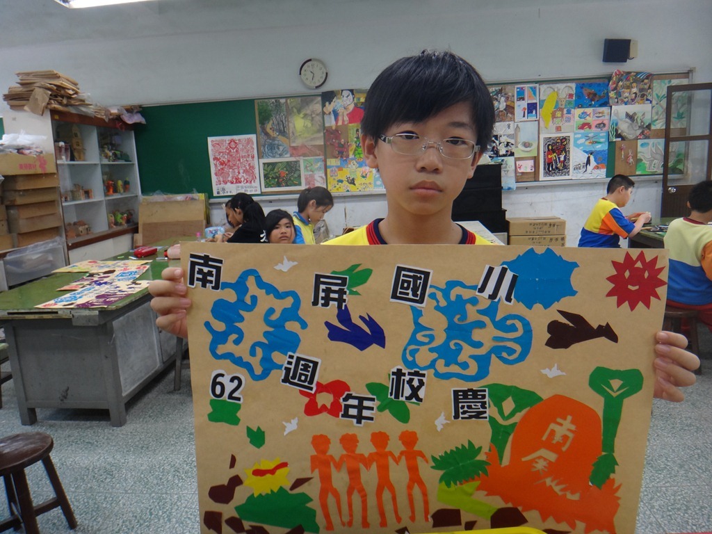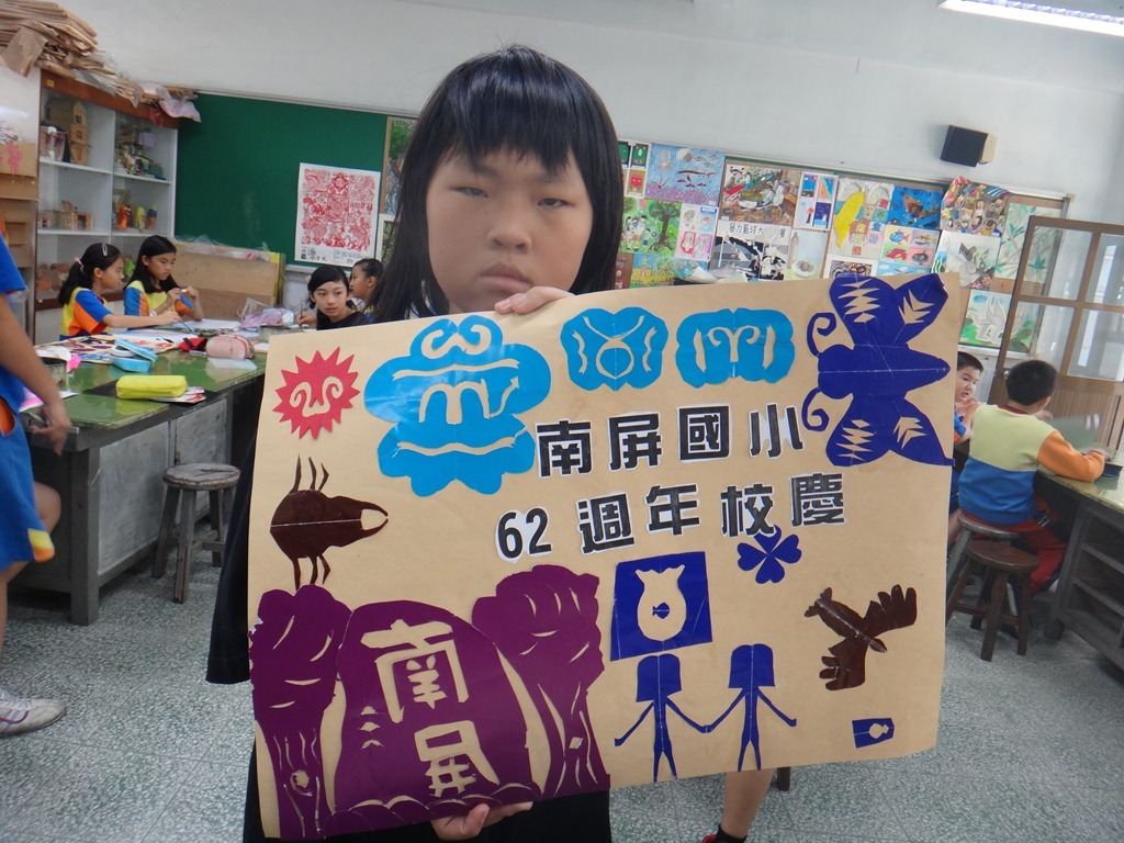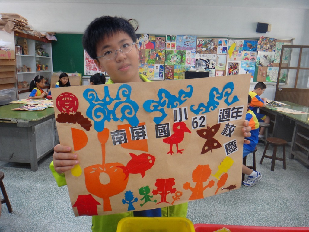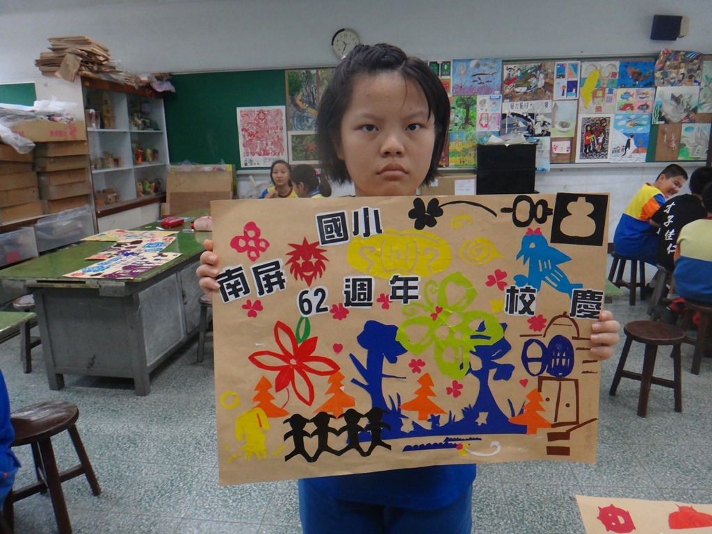 安徒生的剪紙、黃土高原的剪紙、南海藝廊原生植物剪紙的靈感促成這個單元,試上六年級兩班,以太陽、雲、人、樹、花、蝴蝶、南屏校園、蟲、魚、鳥等自創造型剪紙安排海報版面,色紙的大小和顏色要估算一下,四週教學,考驗學生的細膩和耐性。[@more@]
