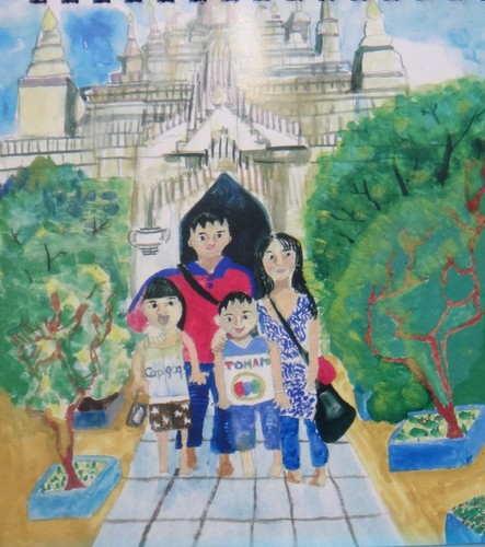宜蘭縣南屏國小學生洪小函以畫作〈古老的寶塔〉獲得繪畫類國小高年級組特優。她說,這幅畫是記錄全家到媽媽家鄉緬甸旅遊。洪小函媽媽中文不好,但為了教女兒功課,會在生字旁加註緬甸發音,協助測驗,非常用心。
