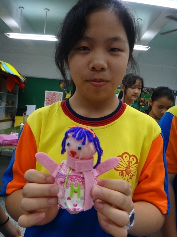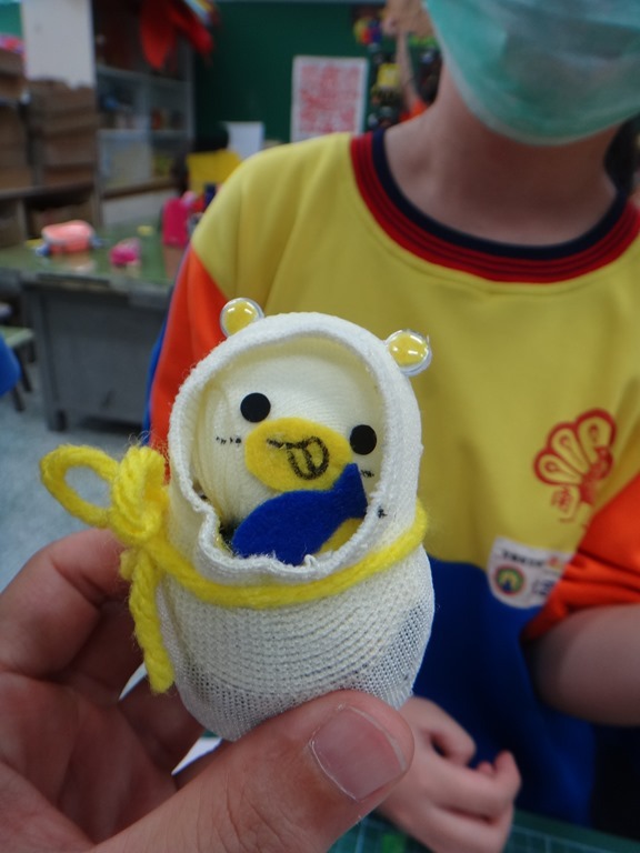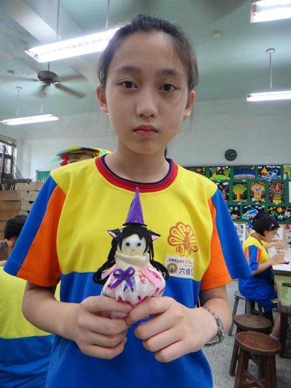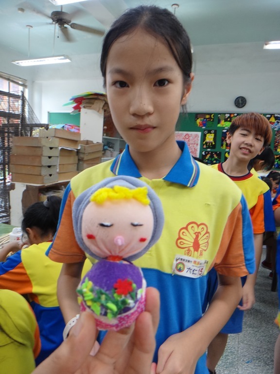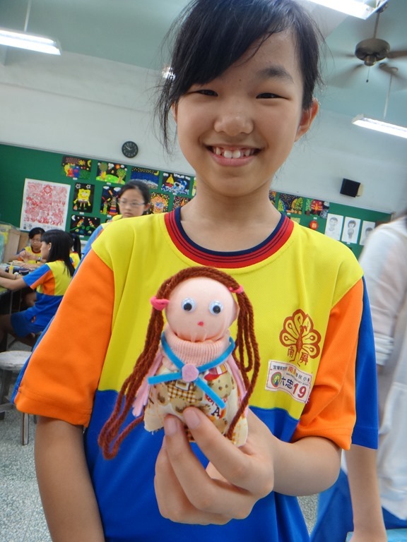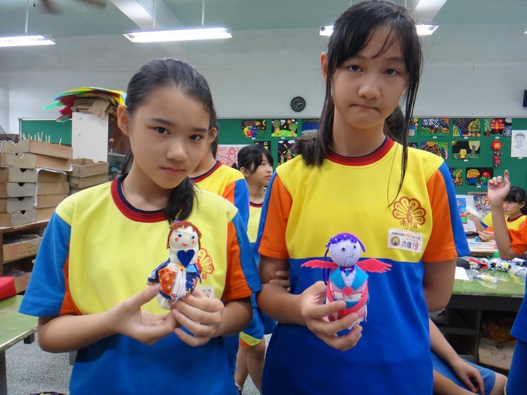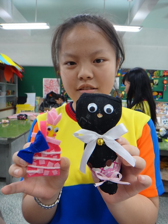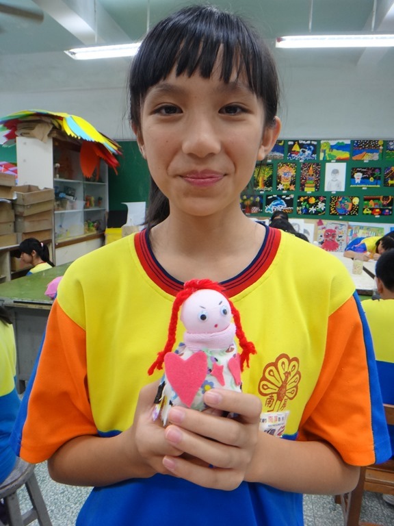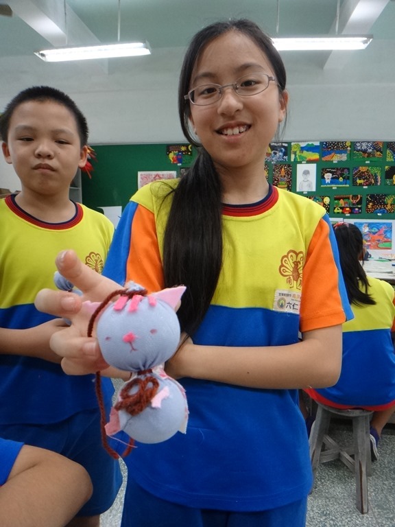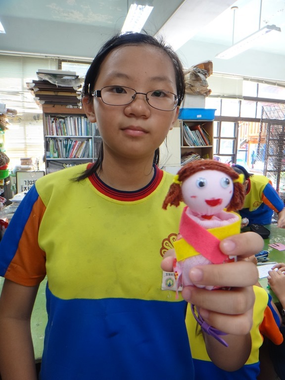 3個班完成,孩子細心和創意無限。嚴格來說,1/3沒有收藏的喜愛感覺,我想:這次用保麗龍膠黏的,不是自己親手縫的,對襪娃的情感不夠,如何營造六年級喜愛自己的創作,是我教學待努力的地方。DSC05462
