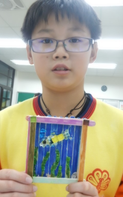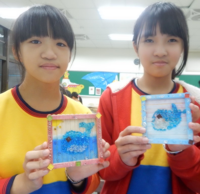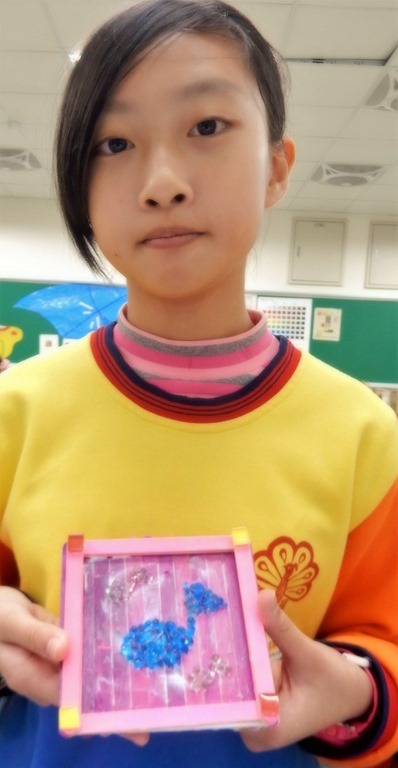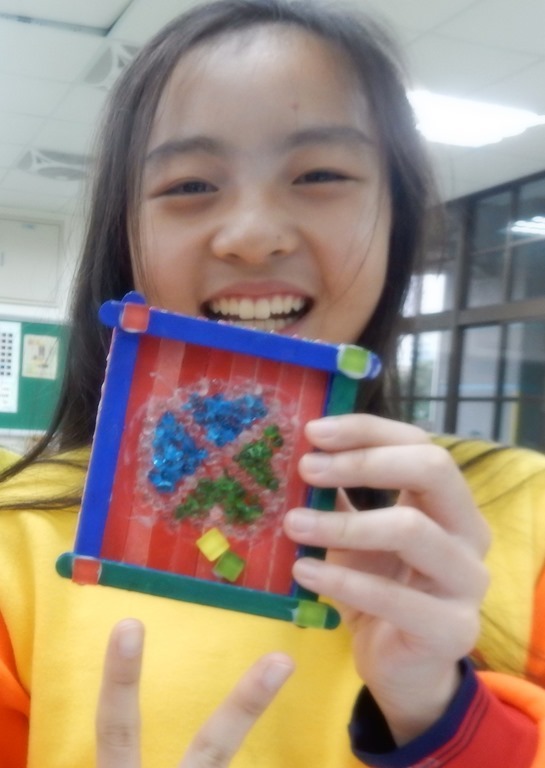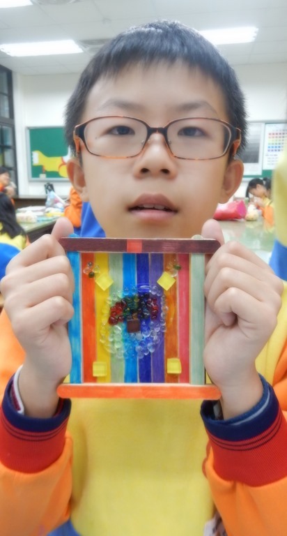 20支冰棒棍,構成方型基座,小圓珠琉璃和6個馬賽克用白膠黏貼,主題和背景色彩對比凸顯01[@more@]