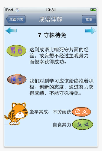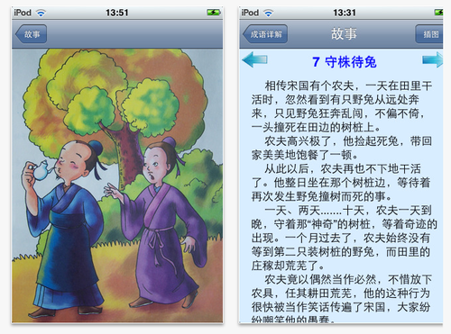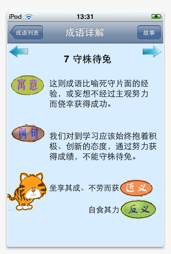 Ipad﹠iphone等教學軟體之運用~語文領域(國語文)Post author:cs100Post published:2011-03-20Post category:ipad[@more@]此軟體雖為簡體中文版成語故事,透過淺顯易懂文字與活潑生動的插圖,進行成語解釋,可讓不論國中小學生容易上手學習,透過早自習一些時間,每天學一個中國歴史典故與文化,增進國學常識。軟體共有40個日常生活常用成語,內容包含:意義、例句示範、近意與反義複詞等,另外還有中文發音。 資料來源與軟體下載網址:http://itunes.apple.com/tw/app/id350555422# 相關內容E化教室行動學習篇_平板電腦充電工具規劃(四)2013-09-21如何在IPAD上使用Instapaper軟體之Read Later2011-04-20ipad開箱文2010-10-11