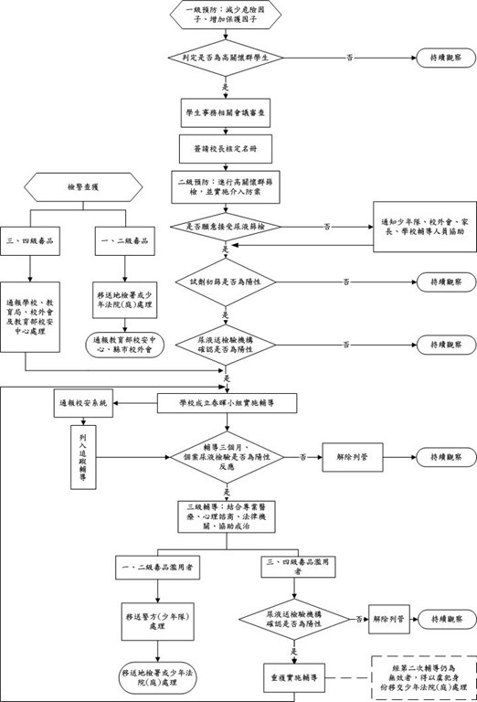 以尿液篩檢呈陽性反應、自行坦承或遭檢警查獲學生為主要對象,發現學生確有藥物濫用行為,啟動輔導機制,協助學生戒除對藥物的依賴,並落實追蹤輔導工作。採行作為有:建立追蹤輔導機制、強化輔導諮商網絡、健全轉介工作,具體工作要項如下。
