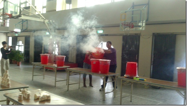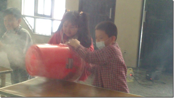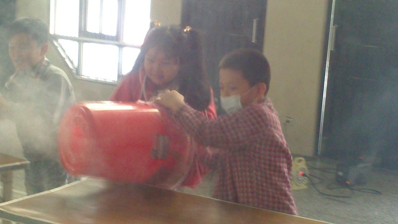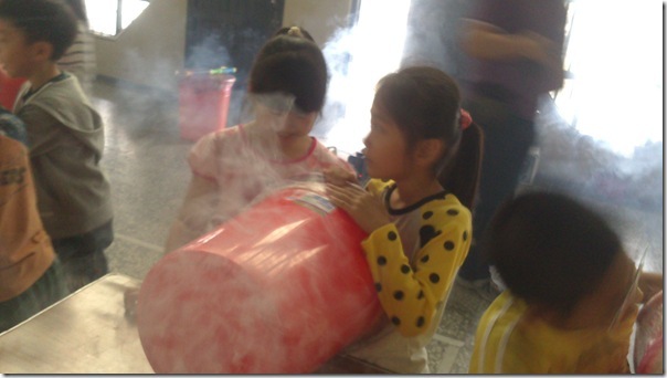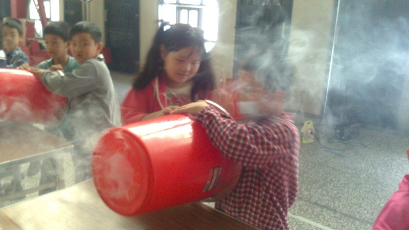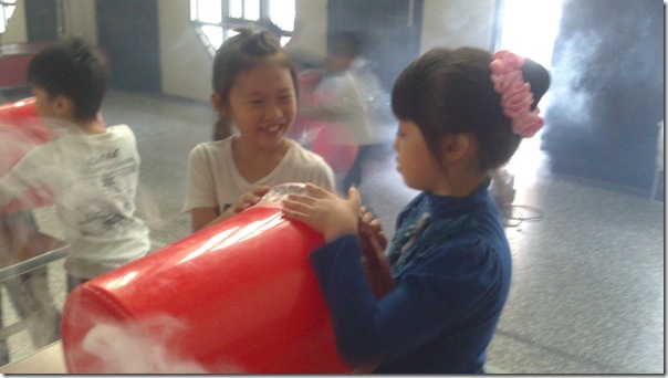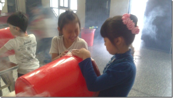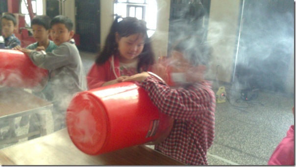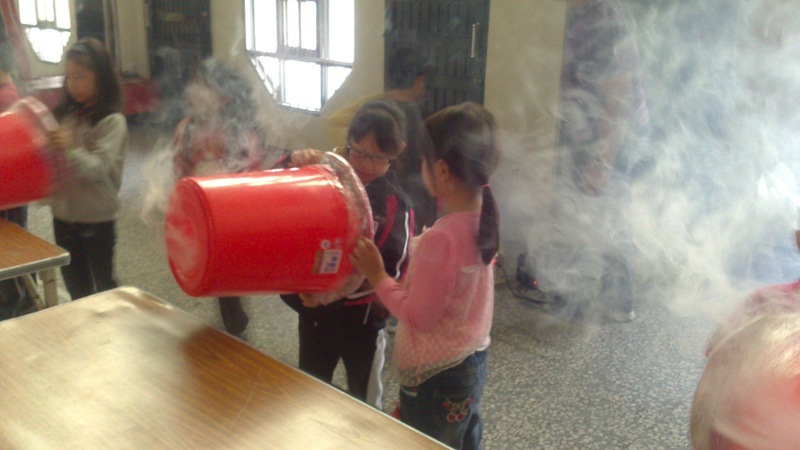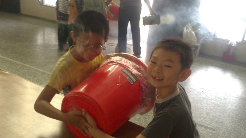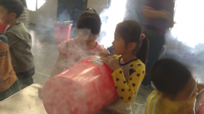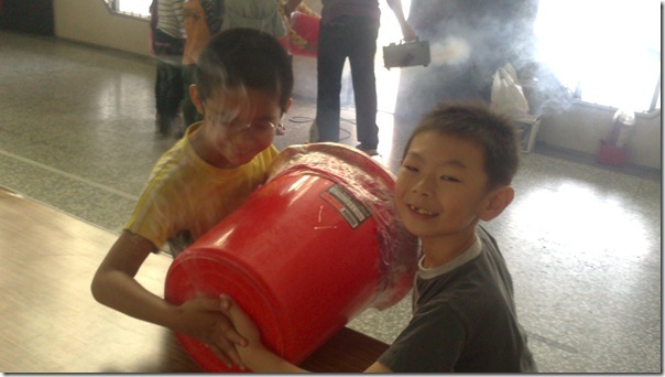 叔叔把大垃圾桶底部打洞,然後再用膠帶封住垃圾桶的開口,接著在垃圾桶裡充入白煙,這樣空氣砲就完成了~