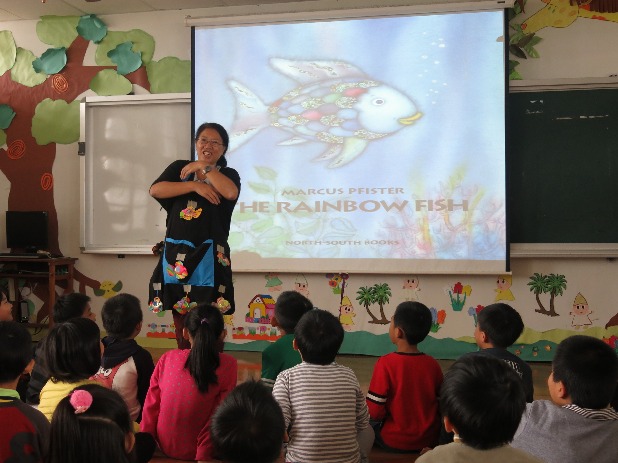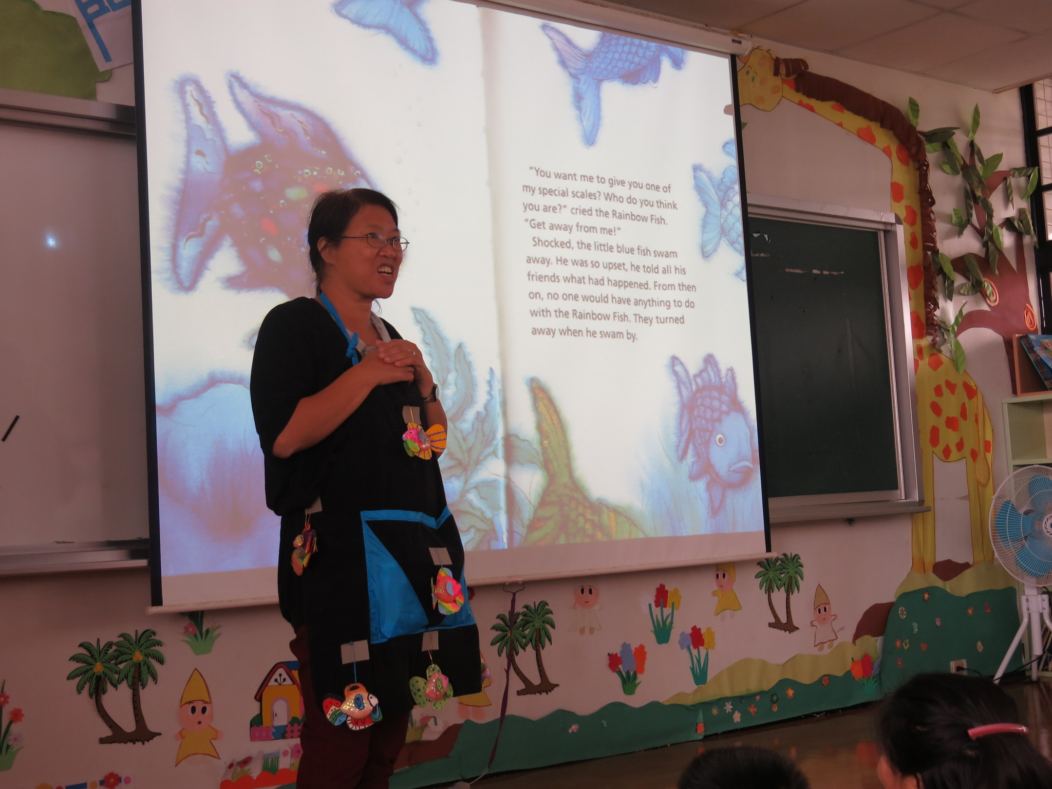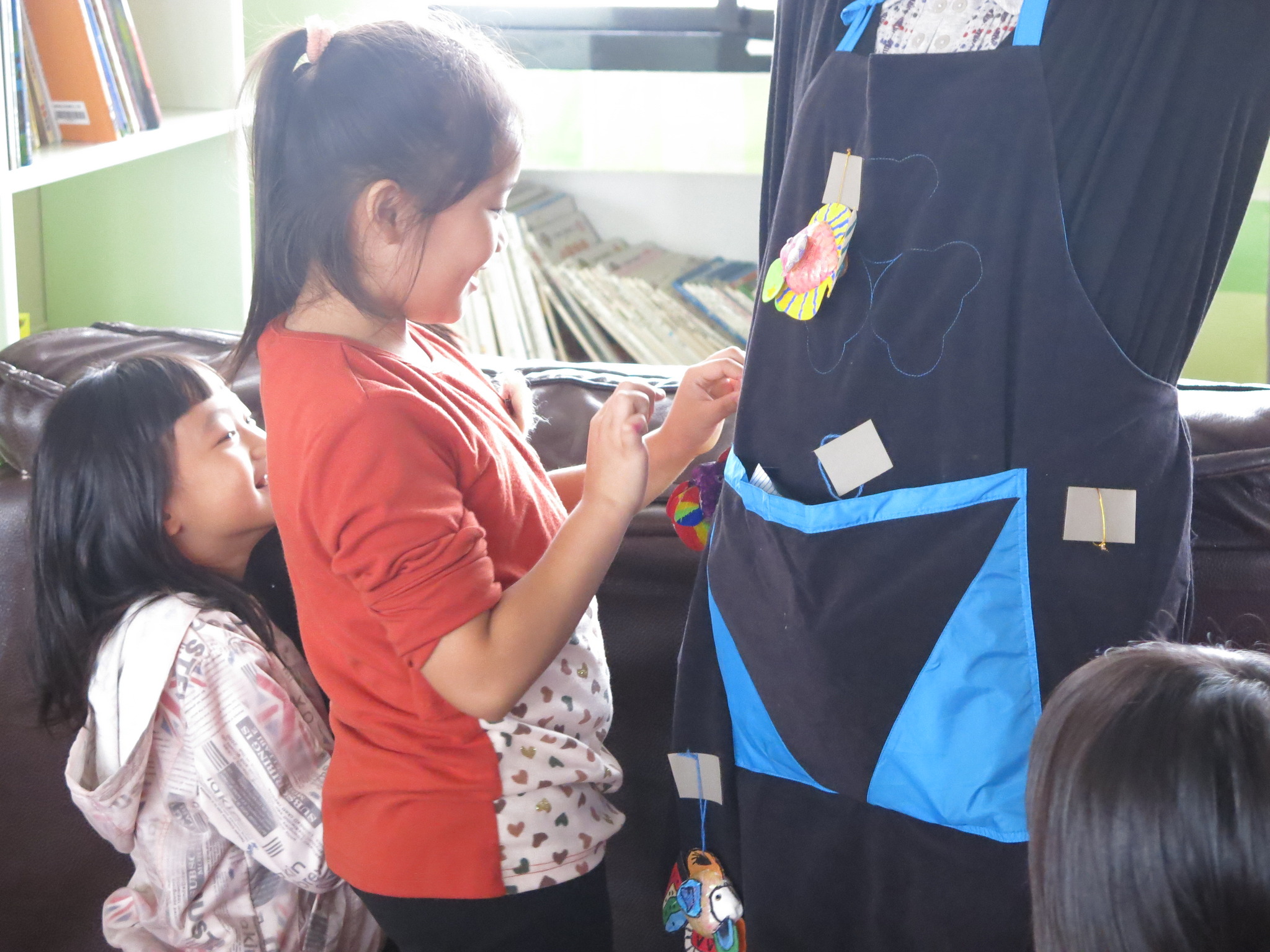 本日的故事列車由 大芬老師 帶來非常精彩的繪本「彩虹魚」,平時嚴肅的大芬老師,說起故事來卻是非常活潑、充滿戲感呢!老師還特別穿上了「故事媽媽圍兜兜」,上面像鱗片一樣貼滿了五顏六色的魚,有的還是自己親手縫的呢~只要有答對問題的小朋友,就可以自己挑一隻帶走喔!是不是跟彩虹魚的故事很有呼應呢?