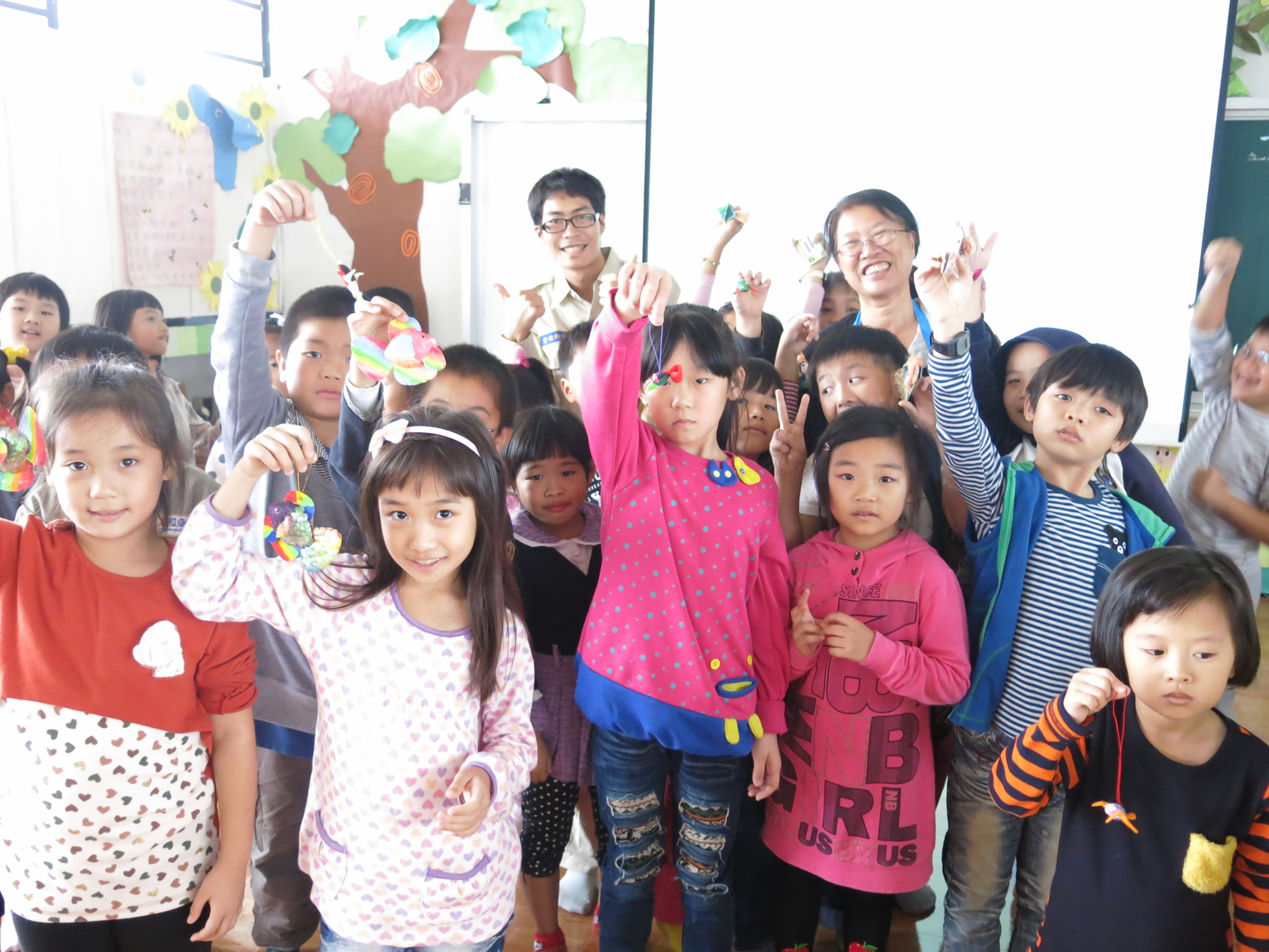 小朋友開心地從大芬老師身上「摘」下彩虹魚