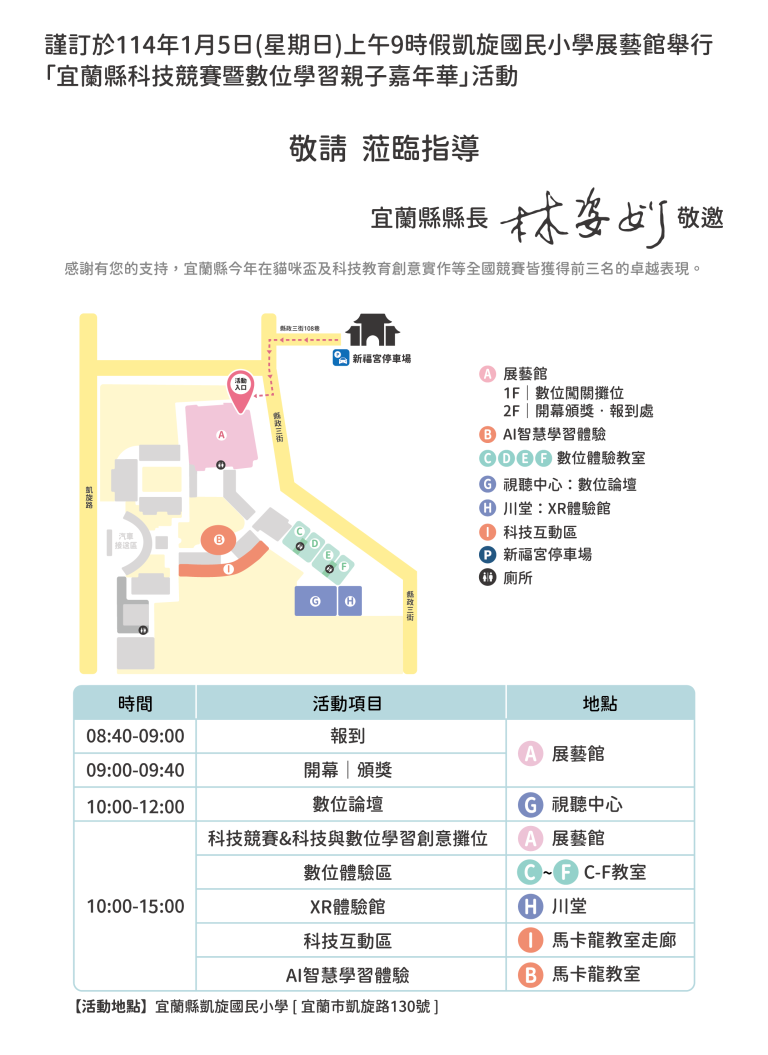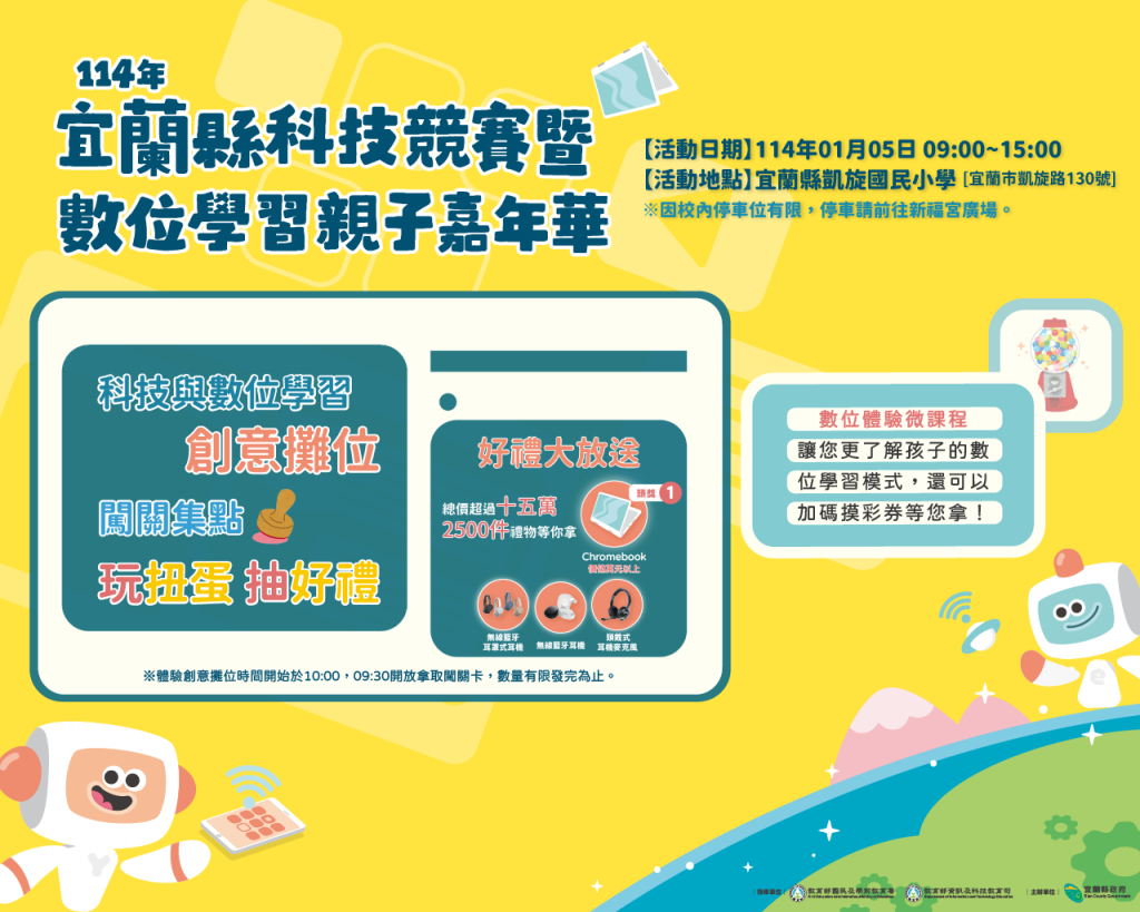 宜蘭縣年度最大科技競賽與數位學習親子嘉年華即將在2025/1/5(日)於凱旋國小展開,現場為大家準備了豐富的體驗活動,歡迎姊姊揪爸爸,弟弟揪媽媽,厝邊倒相揪,一起共襄盛舉。