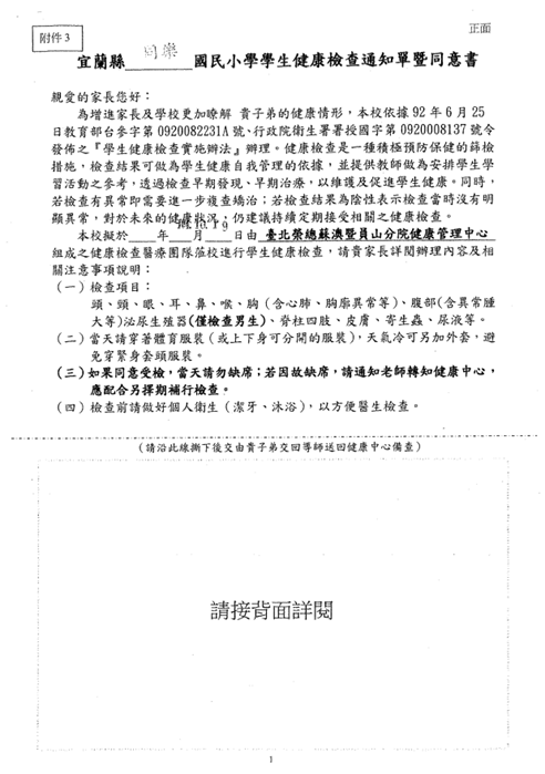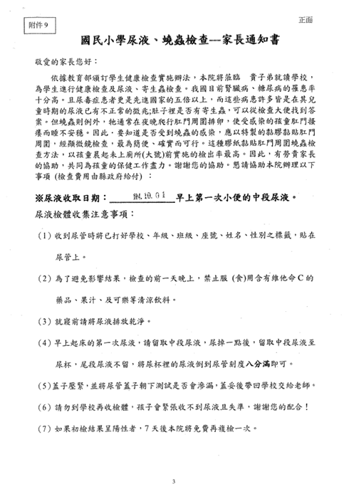 3、中華民國101年12月7日教育部修正發布之「中央補助直轄市及縣(市)政府國民中小學學生健康檢查經費執行工作要點」規定辦理。