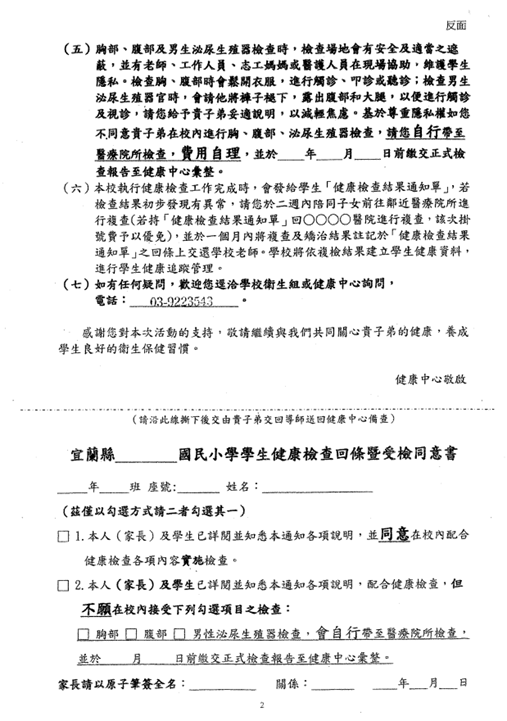 3.各班受檢時請任課教師協助清點人數,若有因故缺席學生,請告知護理師統計以便擇日補檢。