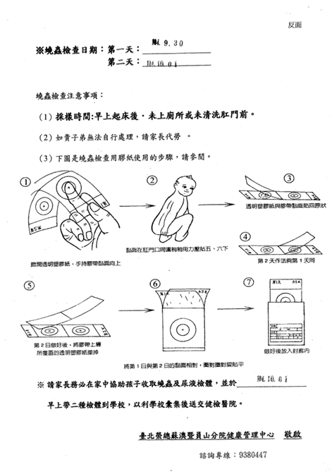 10/2 | 收集尿液、蟯蟲檢體並依醫院排定時間送檢 | 護理師、各班導師 |