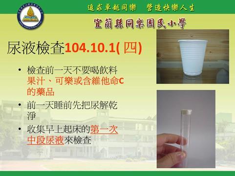 2、尿液、蟯蟲檢查收件:104年10月2日(星期五)上午8:00-9:00、健康中心