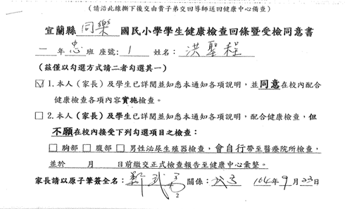 9/15~10/1 | 分發『宜蘭縣同樂國民小學學生健康檢查通知單暨同意書』並請家長簽名後交回 | 護理師、各班導師 |