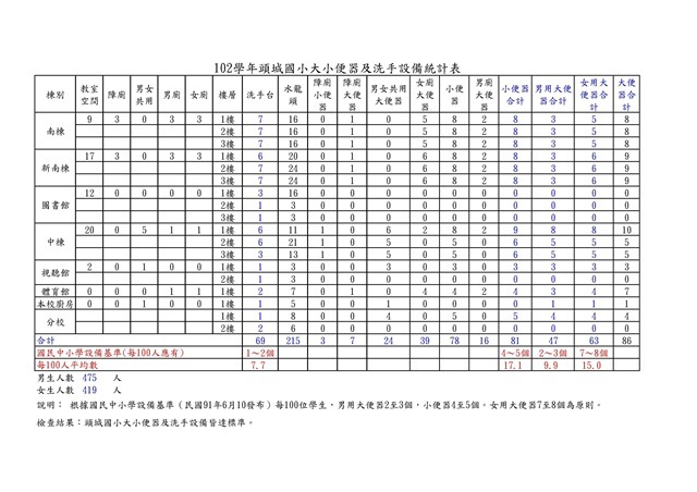 頭城國小便器及洗手設備統計表